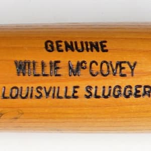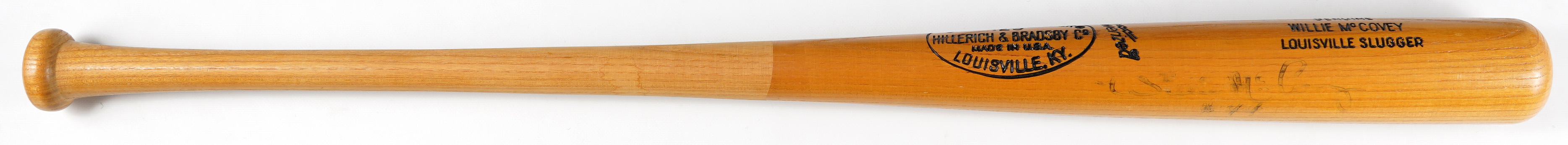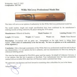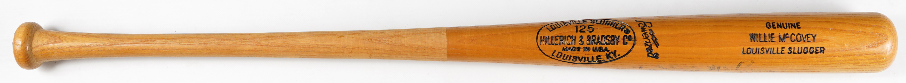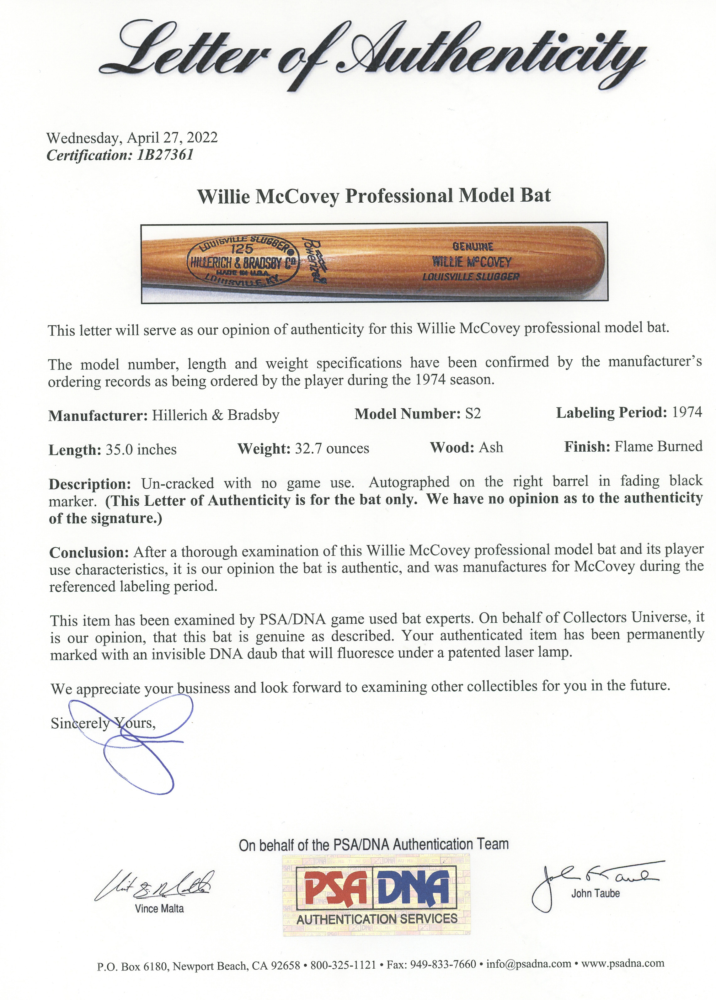 Willie McCovey H&B block-letter model "S2" bat dating from the 1974 manufacturing period, during McCovey's tenure with the San Diego Padres. The LOA from PSA/DNA states: "After thorough examination of this Willie McCovey professional model bat and its player use characteristics, it is our opinion the bat is authentic, and was manufactured for McCovey during the referenced labeling period." McCovey has signed the bat in black ink (which has mostly faded) on the barrel. McCovey began his Major League career in 1959 with the Giants, and even though he appeared in only fifty-two games that year, his 13 home runs, 38 RBI, and .354 average earned him the Rookie of the Year Award. Over the course of the next twenty-one seasons McCovey was one of the game's greatest sluggers, and his total of 521 home runs ties him for twentieth on the all-time list with Ted Williams and Frank Thomas. Included among many individual achievements are three home-run titles (1963, 1968, and 1969) and one MVP Award (1969). McCovey was elected to the Hall of Fame in 1986. Length: 35 inches. Weight: 32.7 ounces. Full LOA from John Taube of PSA/DNA (for the bat only, a corresponding sticker affixed to the barrel end). Auction LOA from James Spence/JSA (for the signature only). The size/weight of this item requires that there will be an additional shipping charge for this lot. The size/weight of this item requires that there will be an additional shipping charge for this lot.