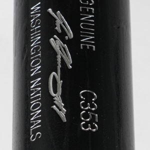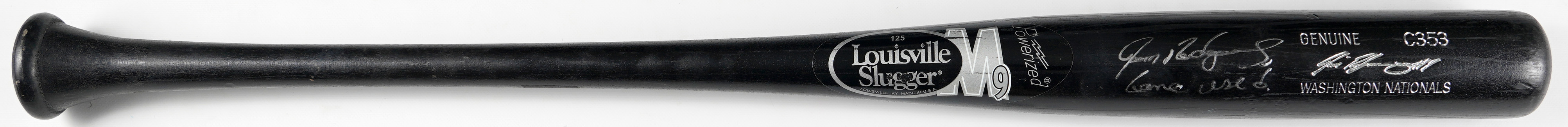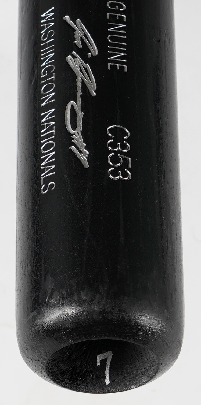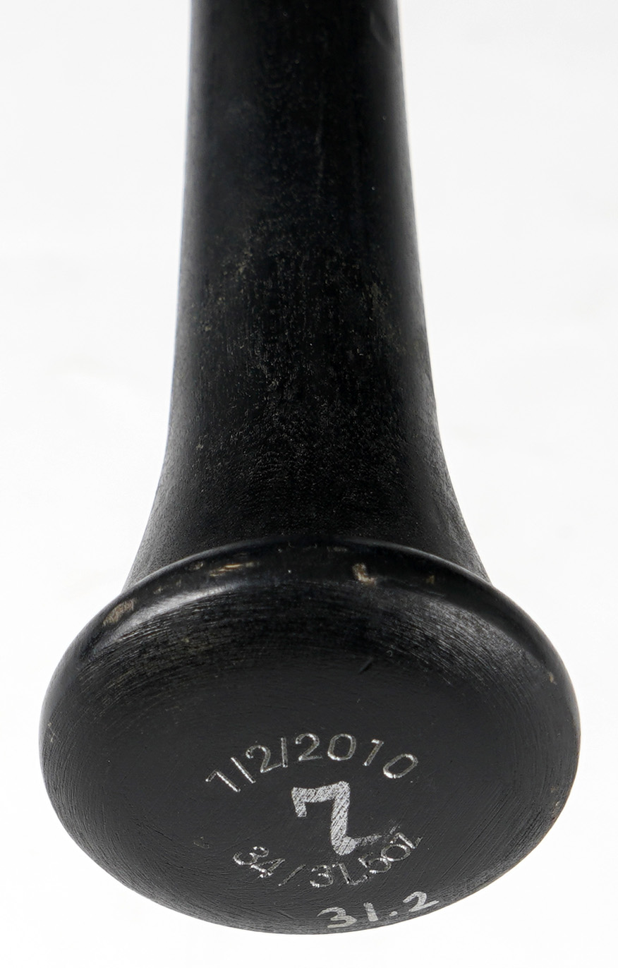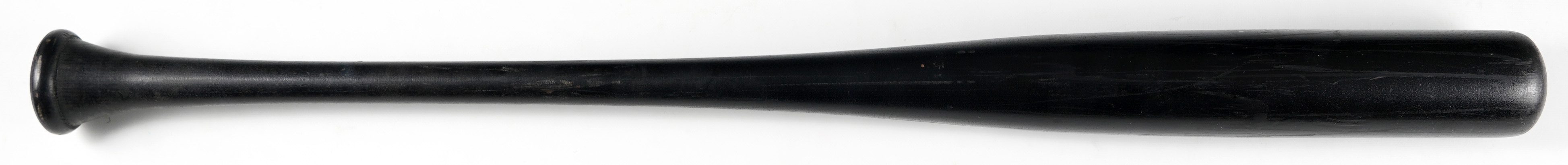 Ivan "Pudge" Rodriguez Louisville Slugger M9 signature-model ("C353") bat dating from the 2010 season. The bat, which is not cracked, displays light use along the barrel, including multiple ball marks and ball-stitch impressions. Etched on the knob is a date ("7/2/2010") and bat length/weight ("34/31.5 OZ"). Rodriguez has signed the bat and written the inscription "Game Used" in silver marker on the barrel. Rodriguez's jersey number ("7") has also been written on the knob in silver ink. A small (approximately two-inch), section of the top wood layer on the handle appears to have been intentionally removed. A letter of provenance stating that this bat originates from the Ivan Rodriguez collection accompanies this lot. Auction LOA from James Spence/JSA. The size/weight of this item requires that there will be an additional shipping charge for this lot.