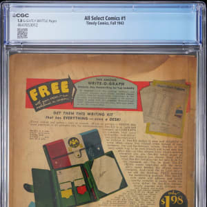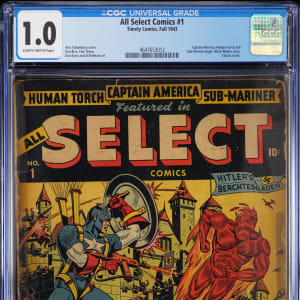 Make a wise choice to go all in for this Fall 1943 Timely Comics All Select Comics #1 issue. Starring Timely's "Big Three", Captain America, Human Torch, and Sub-Mariner, this title ran for eleven issues, from 1943-1945. This #1 issue is greatly prized for Alex Schomburg's classic cover, its first issue status, and of course the Big Three. Beyond that, this seldom seen WWII-era treasure features the last of five Golden Age stories about the Black Widow. Weaponized by Satan, this intriguing, death-dealing character was sent back to the realm of the living, to consign the souls of the wicked to Hell for eternal damnation.