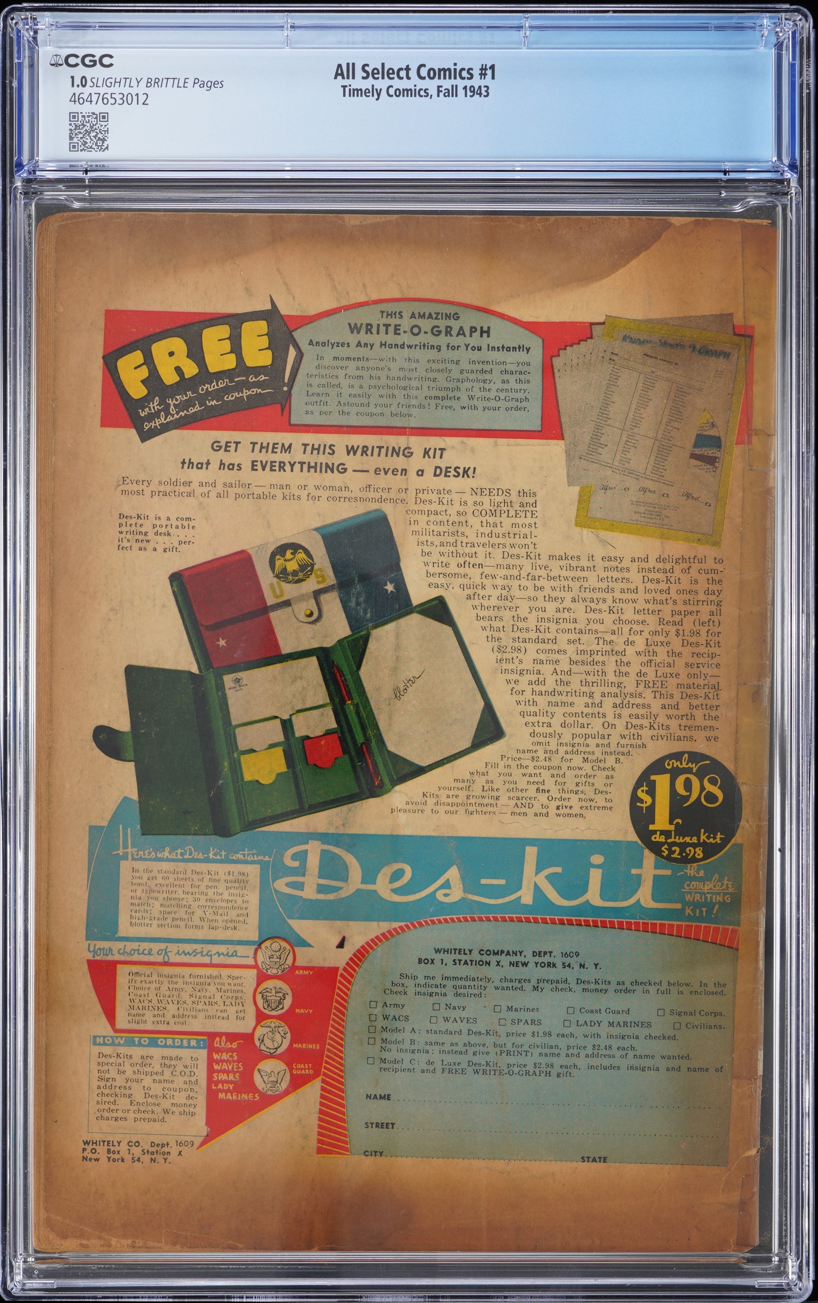 CGC has just returned this long-secluded classic, with a grade of 1.0, Slightly Brittle Pages. To date, CGC has graded 123 copies of this issue, though only 79 are in Universal Grade holders, with the others being restored, qualified, signed, or conserved examples. So even this humble 1.0 graded copy stacks up as a mighty important, complete and unrestored copy, a great find for collectors of Golden Age super-hero comics. Label notes are "Alex Schomburg cover, Don Rico, Chic Stone, Dan Barry and Al Bellman art. Captain America, Human Torch and Sub-Mariner begin. Black Widow story. Classic cover.".