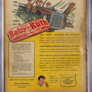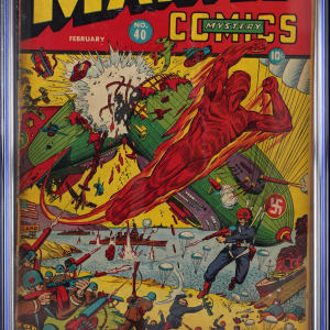 A wonder of air travel, zeppelins have made collector-prized appearances on postage stamps, coins, postcards, posters, and even a famous Heavy Metal rock band's first album cover. Zeppelin enthusiasts give your collection a big lift, with the addition of the 2/43 Timely Comics Marvel Mystery Comics #40 issue. An iconic WWII-era thriller, this issue is much sought after for Alex Schomburg's classic zeppelin cover. This high profile Golden Age comic book is adorned with a riveting scene, featuring flying fireball the Human Torch busting up a Nazi zeppelin, sending it to a watery grave, while U.S. troops furiously defend a strategic beach from a combined air, land and sea invasion. CGC has graded this important key issue comic 1.8. Slightly Brittle Pages. Label notes are "Alex Schomburg cover, Harry Sahle, Carl Pfeufer, Bob Oksner, Syd Shores and Ed Robbins art. Classic Zeppelin cover.".