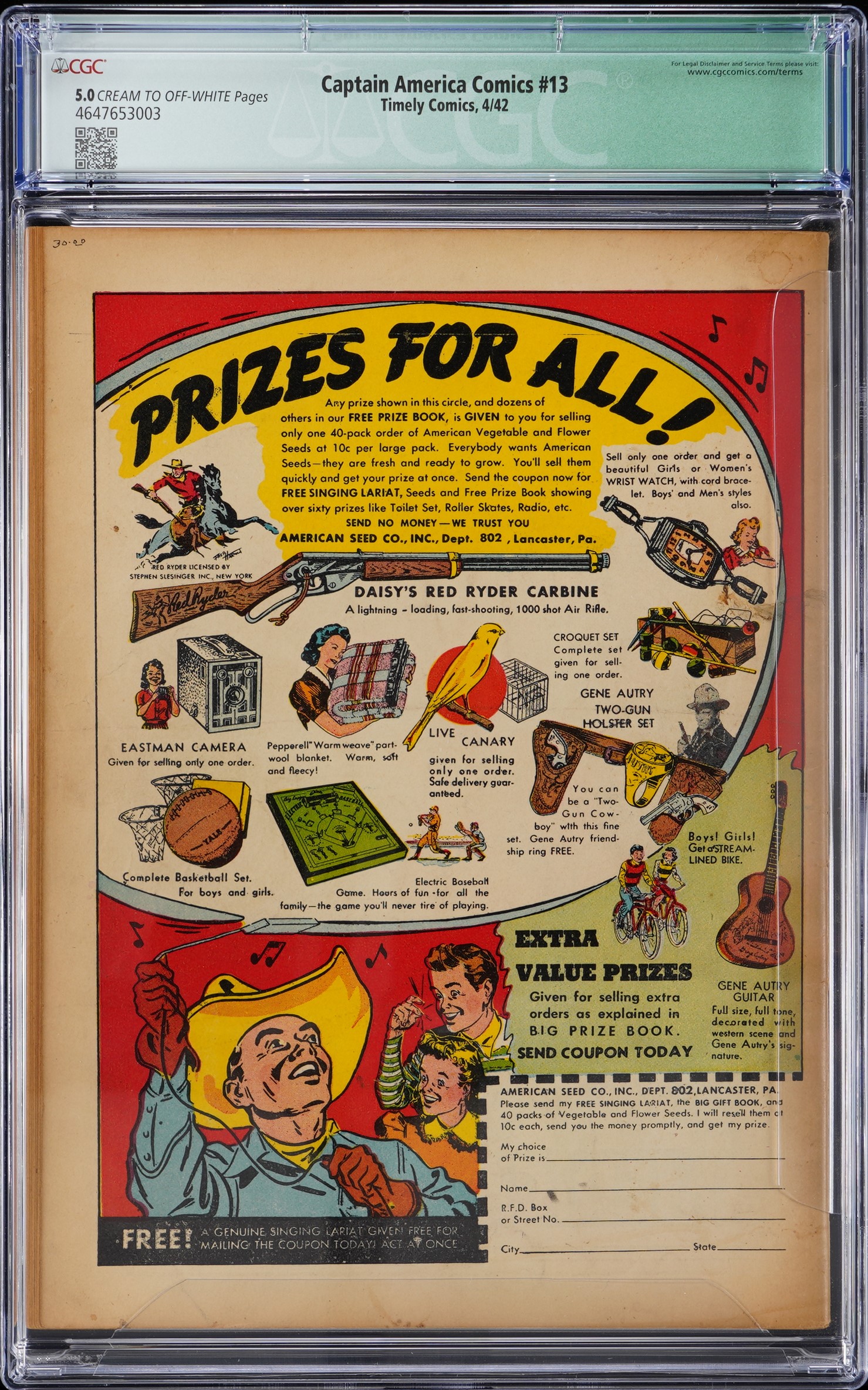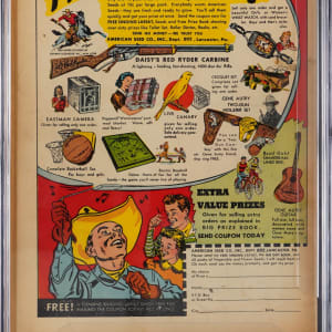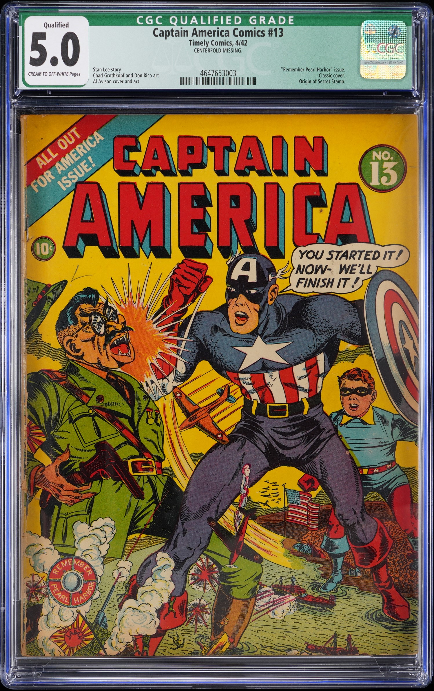 Tojo takes his licks on the front of this 4/42 Timely Comics Captain America Comics #13 “Remember Pearl Harbor” issue. The Japanese bombing of Pearl Harbor had taken place recently, Col. Jimmy Doolittle was plotting his famous payback raid, and Captain America was doing his part on the comic book front, with a knockout uppercut delivered with declaration “You Started It! Now- We’ll Finish It!”, in a rendering by Al Avison that’s regarded as a classic cover. CGC has graded this Golden Age key issue 5.0, Cream to Off-White Pages in a Qualified Holder, due to the absence of the centerfold. Still a tremendous prize for its dynamic cover and historic importance, this one is a must for advanced Golden Age super-hero comic collectors. Label notes are “Centerfold Missing. Stan Lee story, Chad Grothkopf and Don Rico art, Al Avison cover and art. "Remember Pearl Harbor" issue. Classic cover. Origin of Secret Stamp.”.