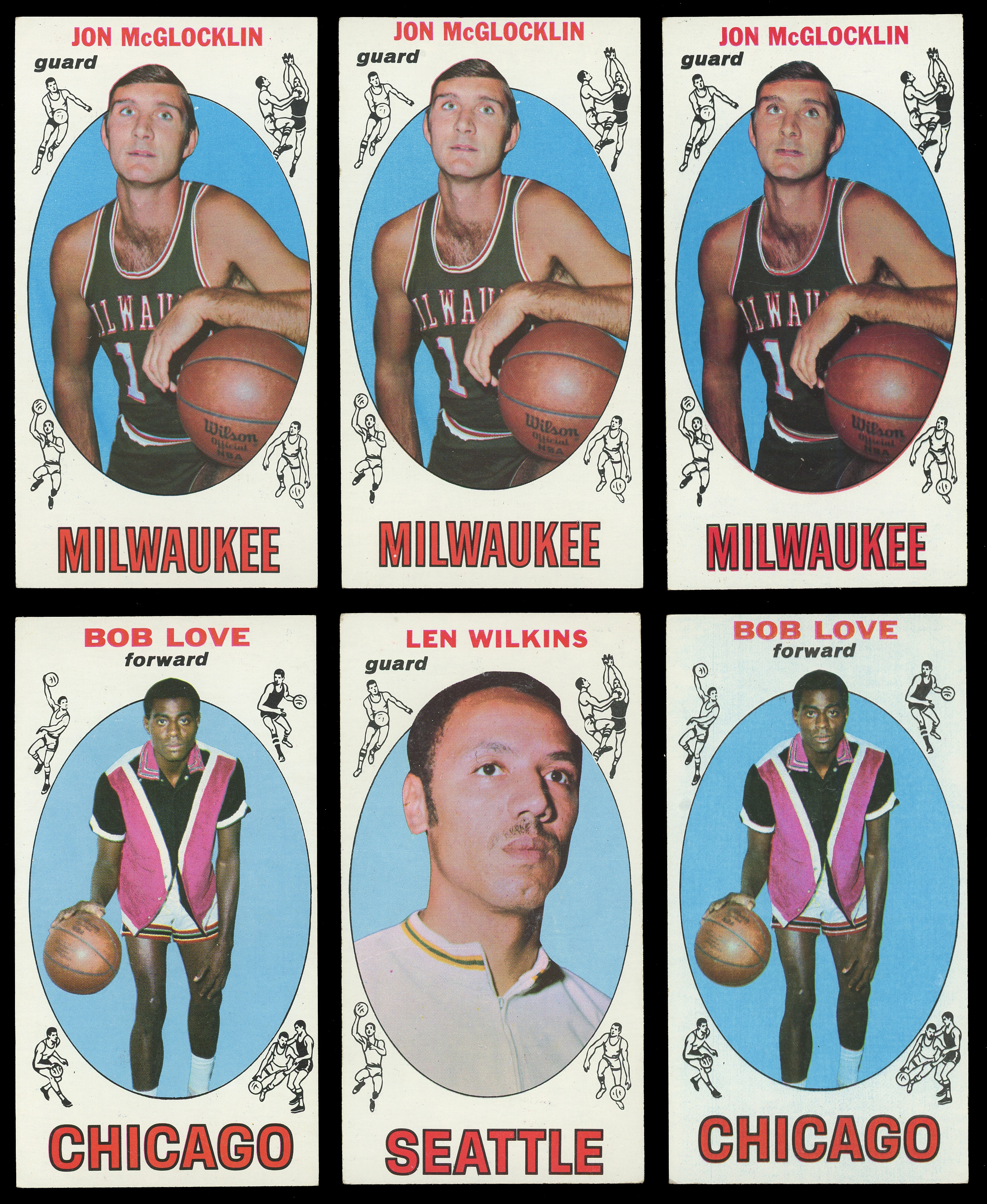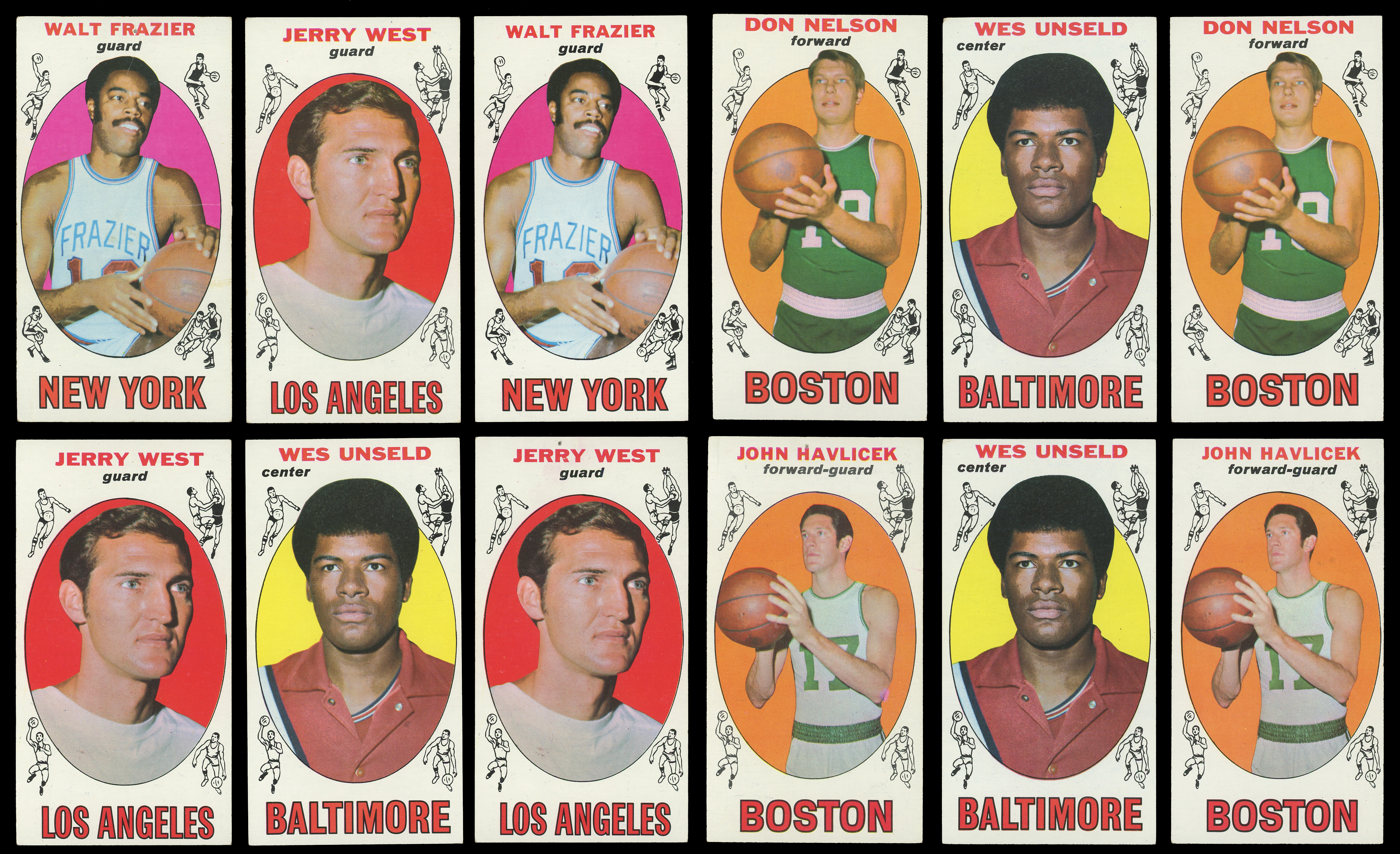 1969-1970 Topps: (150 cards, average EX with 10% pin holes) with #2 Goodrich RC (EX), #10 Thurmond RC (EX), (3) #14 McGlocklin RC (EX, VG-EX, GD), #15 Hawkins RC (VG), (2) #20 Havlicek RC (one EX, one PR, pin hole), #35 Baylor (GD), #44 Wilkens (GD), #45 Lucas RC (VG-EX), #55 Bing RC (VG-EX), (4) #56 Unseld RC (average VG-EX, one pin hole), #60 Reed RC (PR, pin hole), (2) #78 Love RC (VG-EX, VG), (2) #82 Nelson RC (both VG), #85 DeBusschere RC (PR, pin hole), (3) #90 West (one VG-EX, one VG, one PR, pin hole), (2) #98 Frazier RC (one EX-MT, one PR, pin hole);