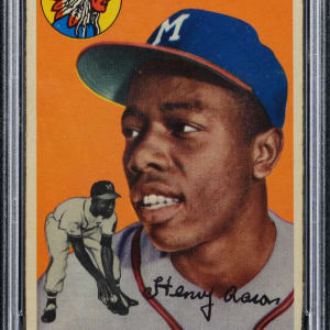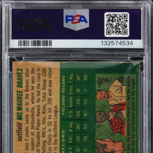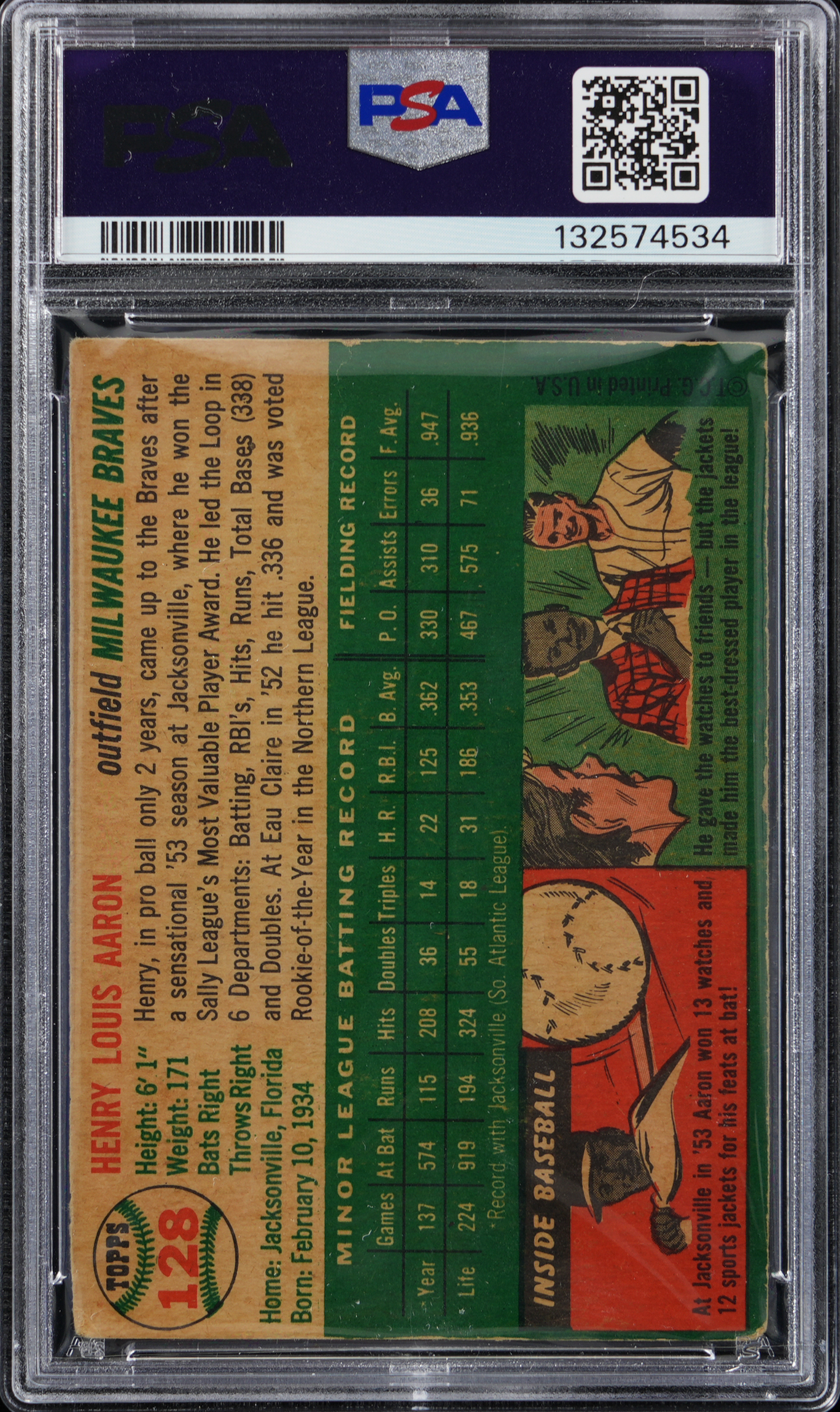 Impressive Eye Appeal! Graded GOOD 2 by PSA. Essential 1954 Topps #128 Henry (Hank) Aaron rookie card. This premiere of the "natural" all-time home run king is amplified by evenly worn corners, bright white edges and stirring dual action/portrait surface colors. A vertical crease tracing from the "M" of Aaron's cap to the top edge does little to disrupt this Milwaukee Braves Hall of Famer's overall presentation. The slighted muted "Inside Baseball" reverse is problem-free. Arrives from the New York-based family of its original owner.