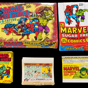 Save the universe and pick up some fine non-sport material with these four 1978-1980 Donruss and Topps Marvel cardboard collectibles. Includes: 1.) (36) 1978 Topps Marvel Comics wrappers with heavy duplication (average NM); 2.) 1978 Topps Marvel Comics display box (presents NM); 3.) 1980 Donruss Marvel Comics Super Heroes Tattoos unopened wax box plus extra wax pack with popped seal. The entire box comes shrink-wrapped by Baseball Card Exchange (owned by Steve Hart, the foremost expert on unopened material).
