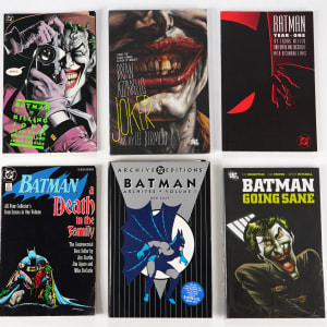 Graphic Novel/Trade Paperbacks singles (63): Joker covers (5): The Killing Joke 1st Print green cover, The Joker’s last Laugh, Devil’s Advocate, The Man Who Laugh, Going Sane; and Batman Year One by Frank Miller; Batman Year Two with Todd McFarlane art; A Death in the Family; A lonely Place of Dying; The Dark Returns; Batman & Dracula; Batman Lobo; Batman Venom; Batman Huntress; Batman Captain America; Batman Daredevil; Spawn Batman; Robin A Hero Reborn; Nightwing Brothers in Blood; Nightwing Mobbed Up; Nightwing A Knight in Bludhaven; Catwoman Defiant; Penguin Triumphant; Batman Riddler; Run Riddler Run; Two-Face; Two-Face Year One; Arkham Asylum; Gotham by Gaslight; Arkham Asylum Living Hell; Batman: Son of the Demon; Batman Versus Predator; Batman Aliens Two; The Long Halloween; Knights End; Bruce Wayne: Murderer?; Evolution; Castle of the Bat; The Ultimate Evil; Holy Terror; Batman Chronicles: The Gauntlet; Tales of the Demon; Death Blow; Death and Madness; War Drums; Crimson Mist; Shaman; Bloodstorm; Hush; Year 100; In the Line of Duty; Hong Kong; Batman and the Mad Monk; Officer Down; Prey; The Ultimate Evil; Batman and the Monster Men; The Abduction; Switch; Legends of the World’s Finest; Scar of the Bat; Haunted Knight;