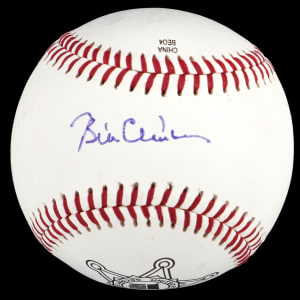 Offered is a highly collectible baseball, boldly signed by 42nd President of the United States, Bill Clinton. The former Chief Executive's blue ballpoint pen signature is clear and well-centered on the sweet spot. This sharp signature is presented on a Rawlings OLB1 Official League baseball adorned with a distinctive United States Secret Service logo, giving it an historic context. A rare and desirable piece for collectors of presidential memorabilia, sports-related autographs, or iconic American history artifacts, this one is certainly an attention-getter.