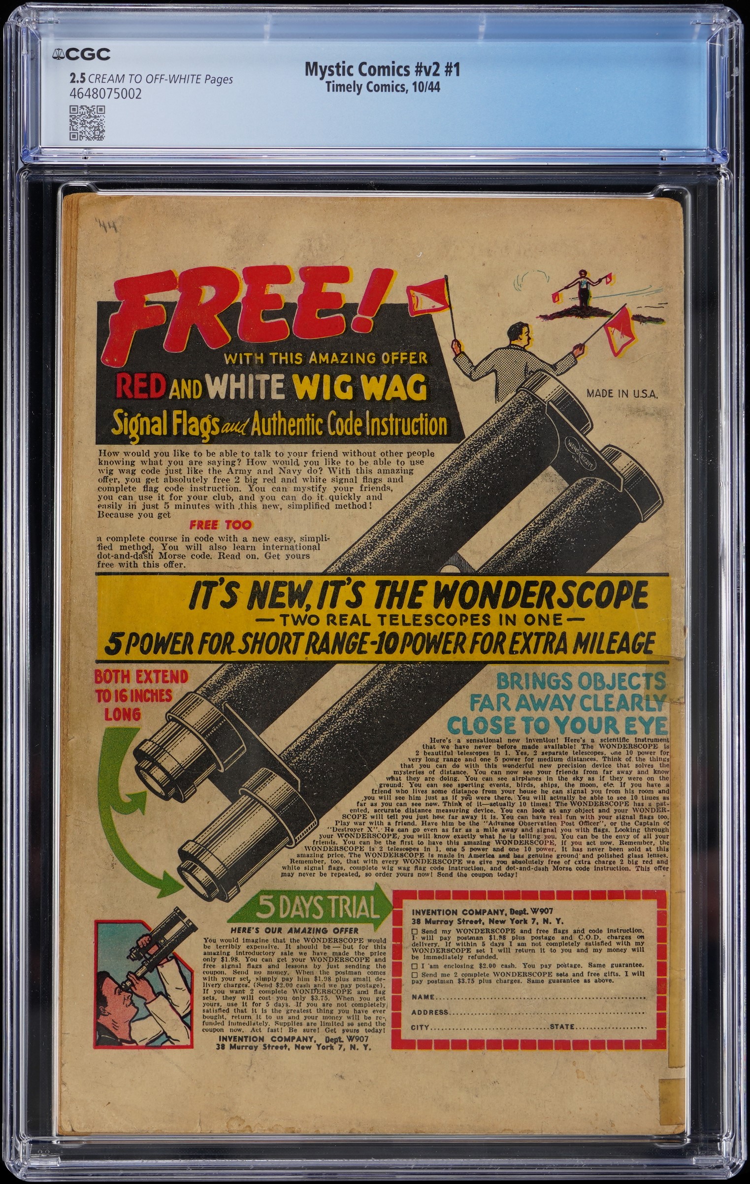 Presented is a mid-grade example of Mystic Comics Volume 2, #1 issue. This first issue is the key to Timely Comics second Golden Age Mystic Comics series, from a four-issue run featuring a mix of superhero and fantasy adventure stories, typical of the World War II era. This CGC 2.5, Cream to Off-White Pages copy is unrestored and complete, offering collectors a rare opportunity to own a solid example of one of Timely’s wartime anthology series. A historically important and highly collectible issue — essential for Golden Age and Timely-era comic collections. Label notes are "Charlie Tomsey art, Syd Shores cover and art. Angel, Human Torch, Destroyer, Terry Vance and Tommy Tyme begin.".
