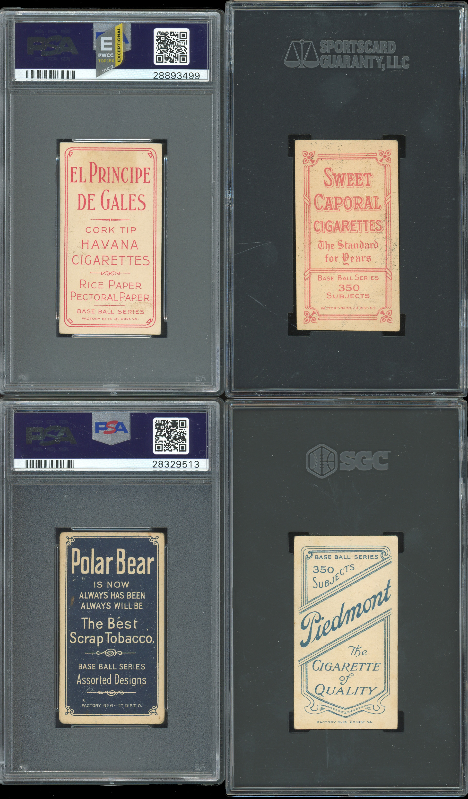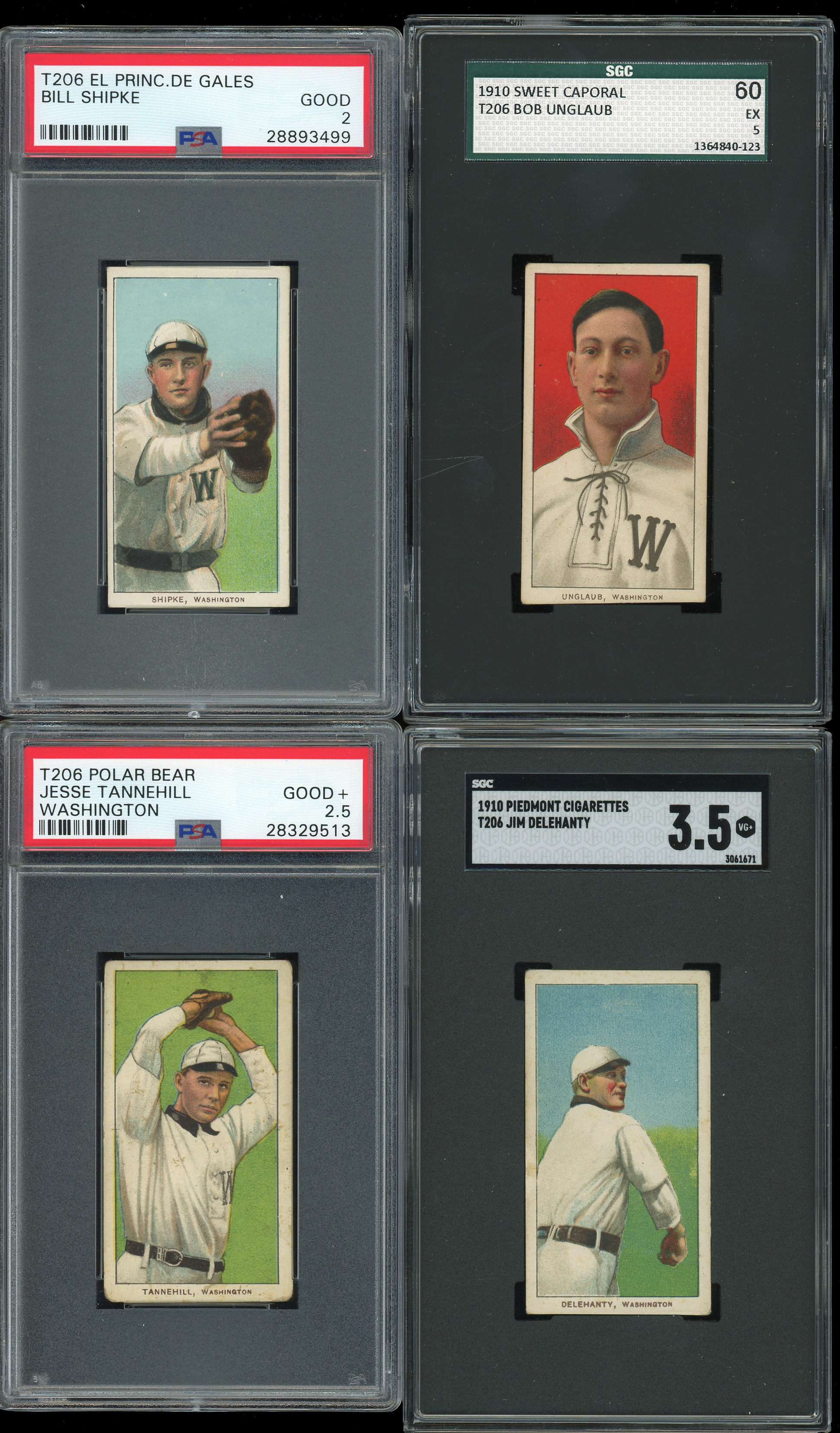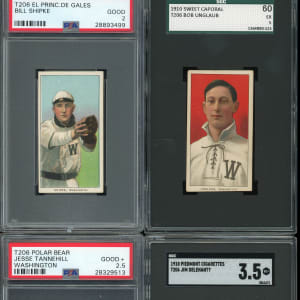 Each graded by either PSA or SGC with common advertising backs, unless noted. Turn-of-the-century ballpark residents of our nation's capital take the field with these (8) 1909-1911 T206 White Border Washington Senators tobacco cards. Includes: SGC EX 5: Unglaub; PSA VG-EX 4: Groom; SGC VG+ 3.5: J. Delehanty; PSA VG 3: (2 cards) with Ganley, Gray; PSA GOOD+ 2.5: J. Tannehill (Polar Bear); PSA GOOD 2: (2 cards) with Conroy (Fielding, Old Mill) and Shipke (El Principe De Gales).
