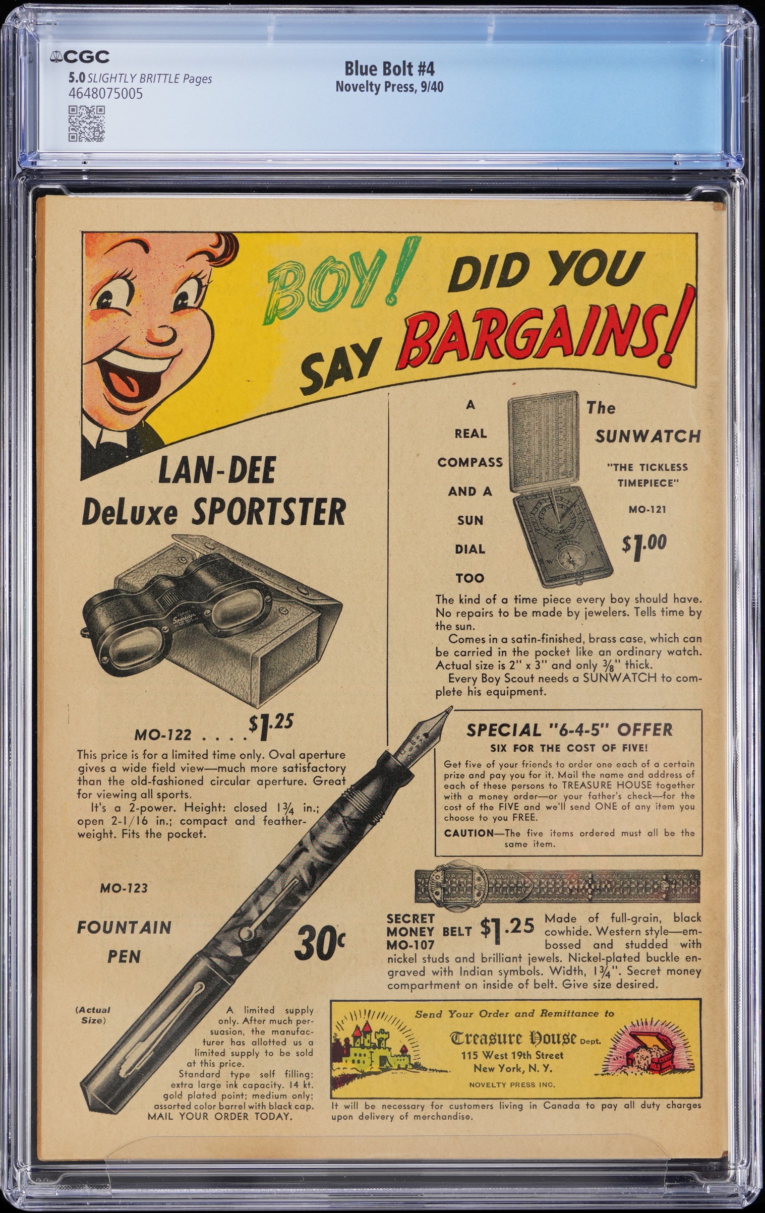 Strong mid-grade example of Blue Bolt #4, an early Golden Age issue showcasing the dynamic collaboration of Joe Simon and Jack Kirby in one of their first major superhero features. Issued during the earliest days of the wartime comics boom, Blue Bolt combined science fiction and costumed heroics in a style that anticipated the patriotic themes the duo would soon perfect in their renowned Captain America Comics run. Published in 1940 during the first year of Blue Bolt's run, this CGC graded 5.0, Slightly Brittle Pages copy displays deep color and solid structure, making it an appealing representative of the series’ formative period. A desirable and historically important early Simon & Kirby issue — a cornerstone for Golden Age and Timely-era collectors alike. Label notes are "Bill Everett cover, Joe Simon, Jack Kirby and Henry Kiefer art. Full page Basil Wolverton Spacehawk ad.",