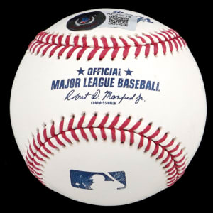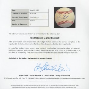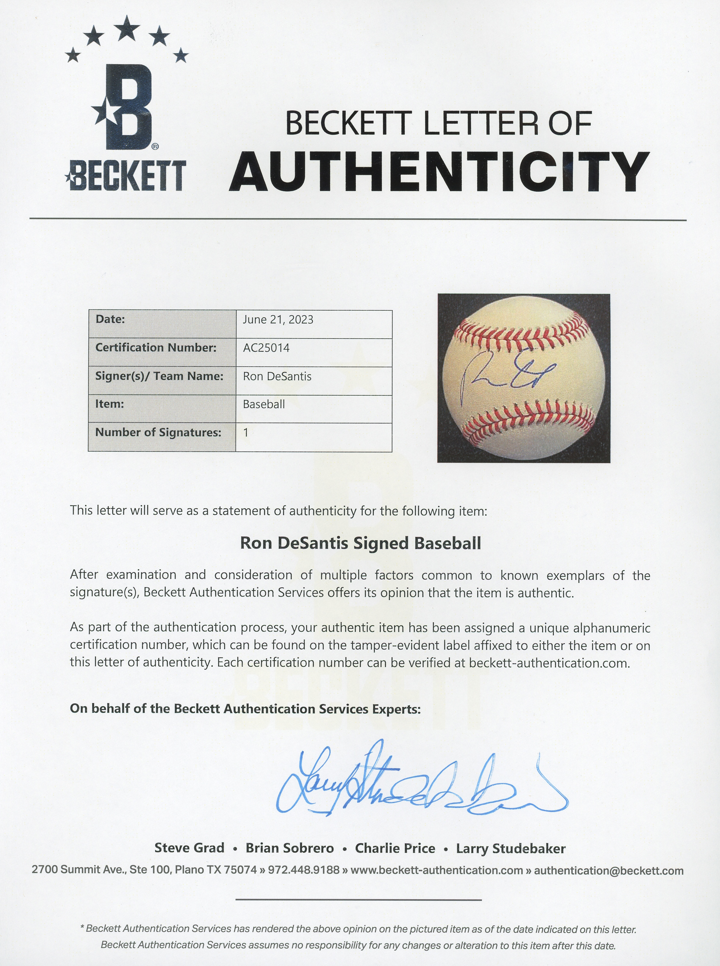 Ron DeSantis, the 46th governor of Florida, has been serving since 2019. He has applied an (“8-9”) signature to the sweet spot of this white OML/Manfred ball. The ball has a Beckett Sticker and comes with Full Beckett LOA.