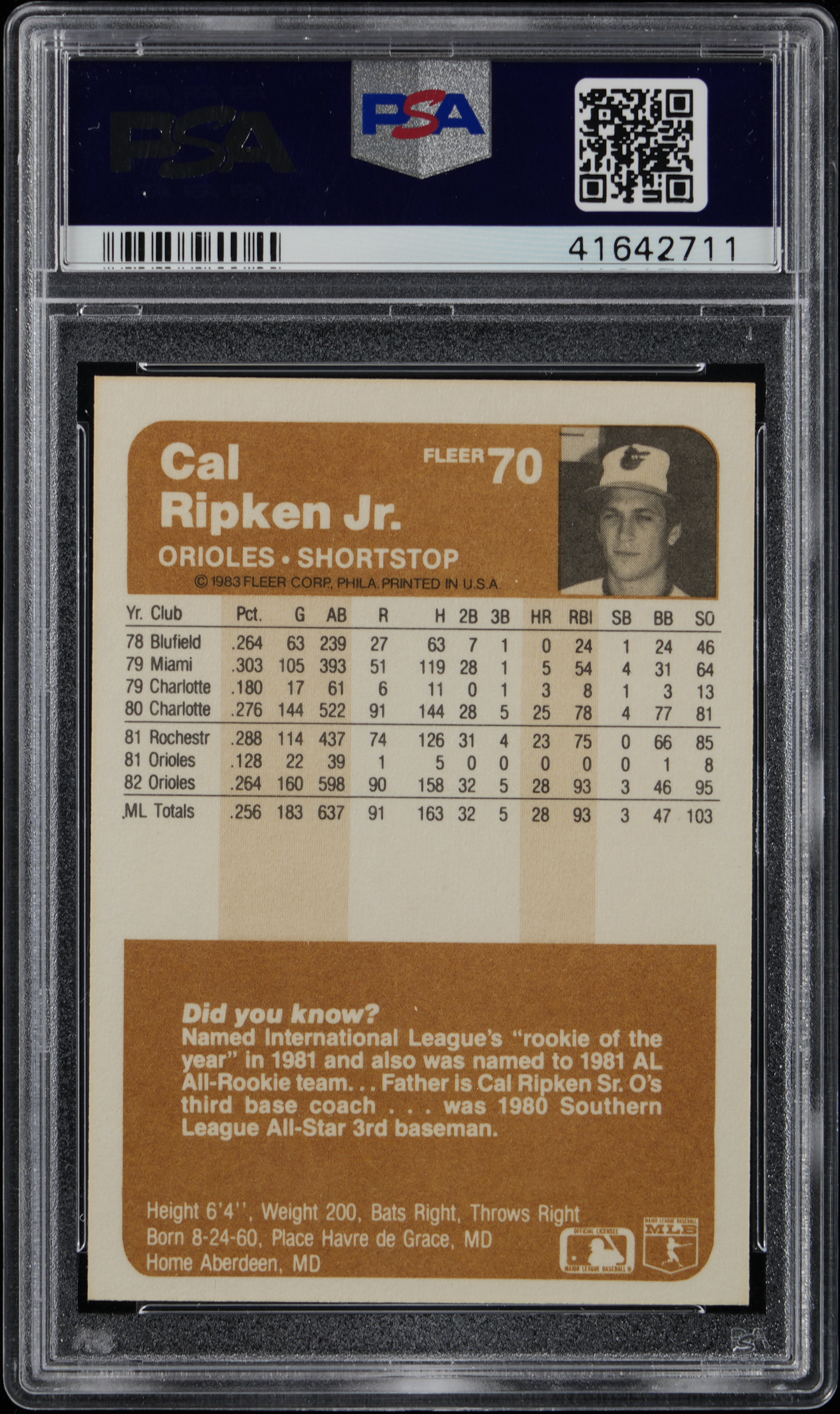 Graded GEM MINT 10 by PSA. Flawless 1983 Fleer #70 Cal Ripken Jr. second-year card. Baltimore Orioles Hall of Famer.
