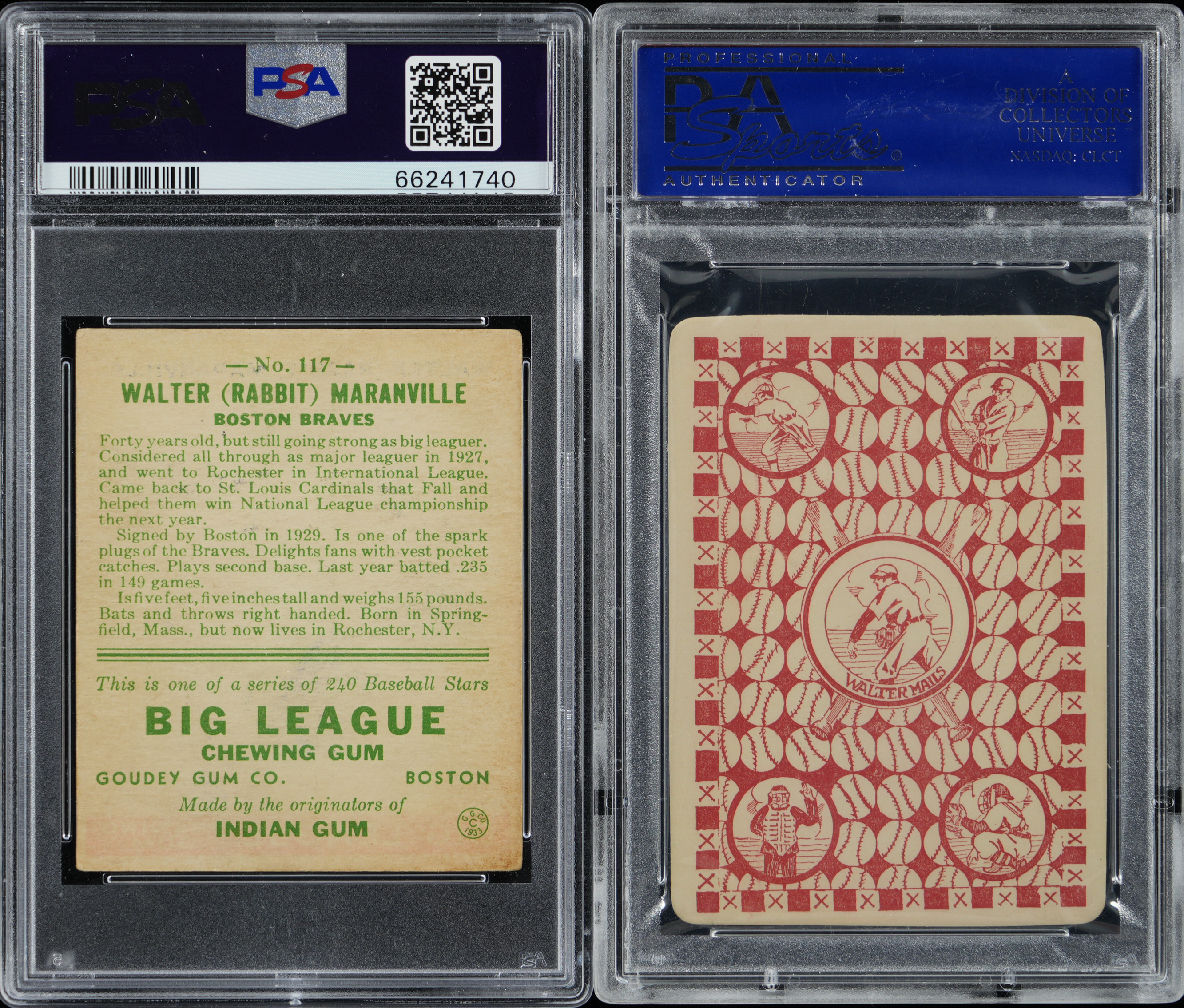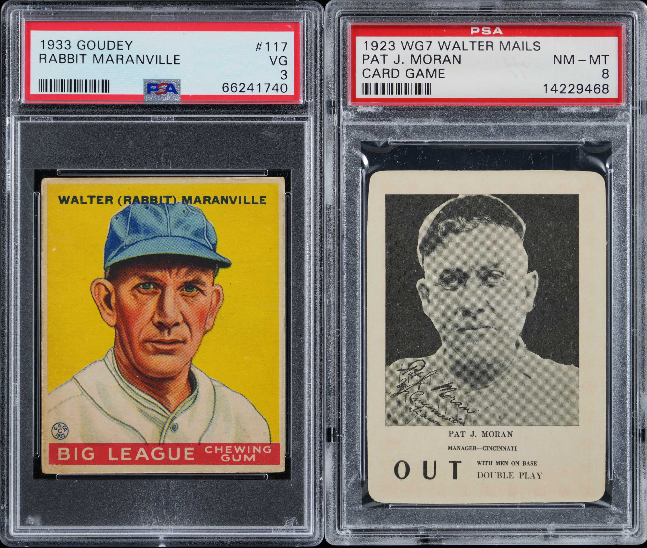 Each graded VG 3 by PSA. This pre-war pairing includes: 1.) 1923 WG7 Walter Mails Card Game Moran (PSA NM-MT 8) and 2.) 1933 Goudey #117 Maranville (PSA VG ).