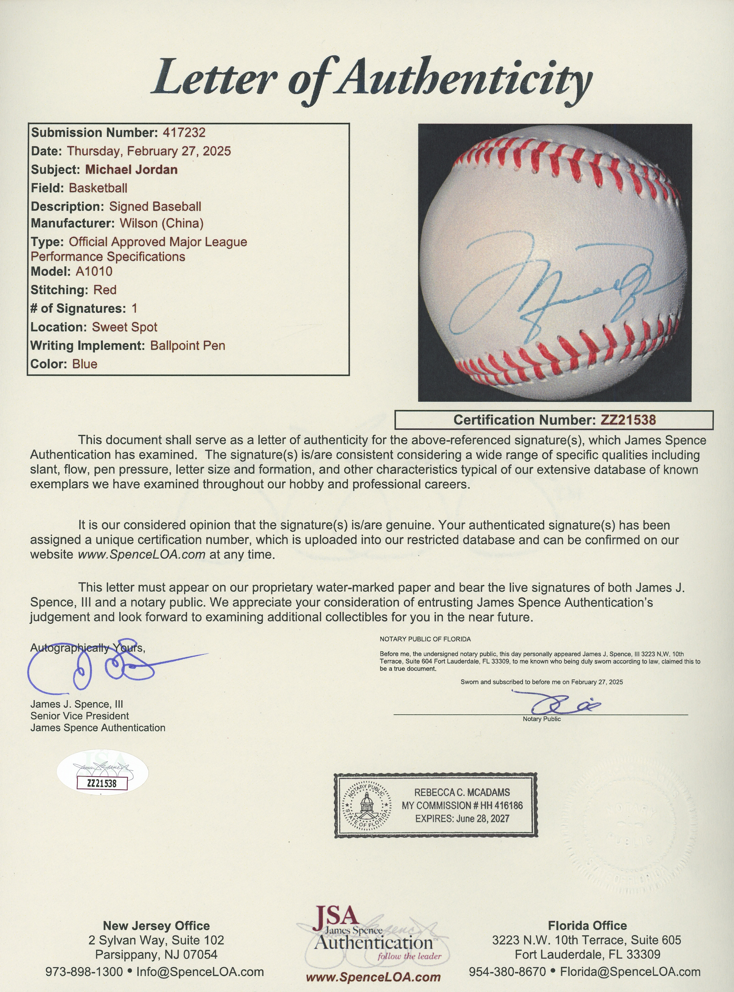 6X NBA champion and minor league baseball hopeful Michael Jordan made a sweet crossover move, when he signed this Wilson A1010 Official Approved Major League Performance Specifications baseball. Basketball's GOAT has signed satisfactorily on the sweet spot of this pristine ball.
