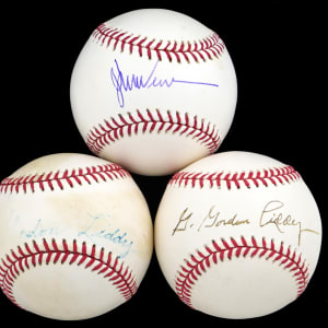 G. Gordon Liddy signed white ONL/White ball with faded (“2-3”) signature and JSA Sticker and Basic Cert.