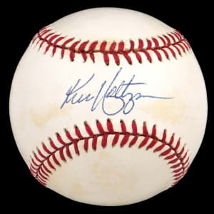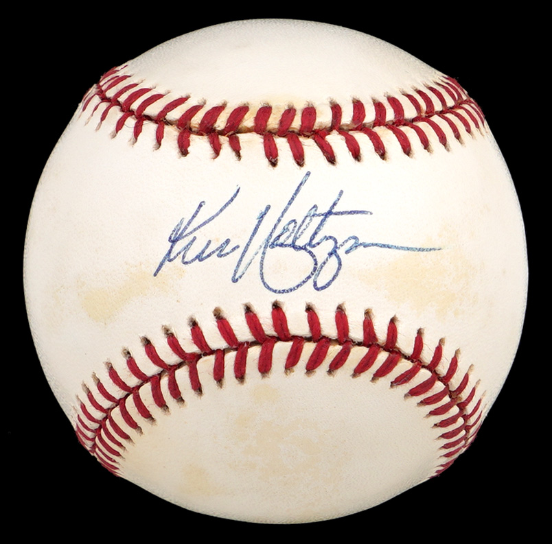 Recently departed lefty Ken Holtzman makes a welcome auction appearance, with this single-signed baseball. While Holtzman did not quite live up to the "new Sandy Koufax" touting from his early days, he did throw two no-hitters. His 174 lifetime wins makes him the all-time leading Jewish pitcher, with nine more victories than Koufax. Holtzman threw a strike down the middle when he signed this handsome ONL/White baseball, delivering an attractive sweet spot signature. The ball retains bold factory labeling and shows light, sporadic toning.