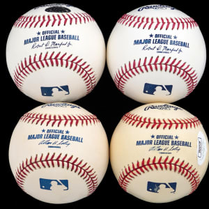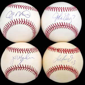 Four of the greatest football throwing arms of the 1980s have signed these four baseballs. Three of them have also inscribed their uniform numbers.