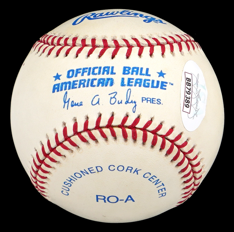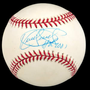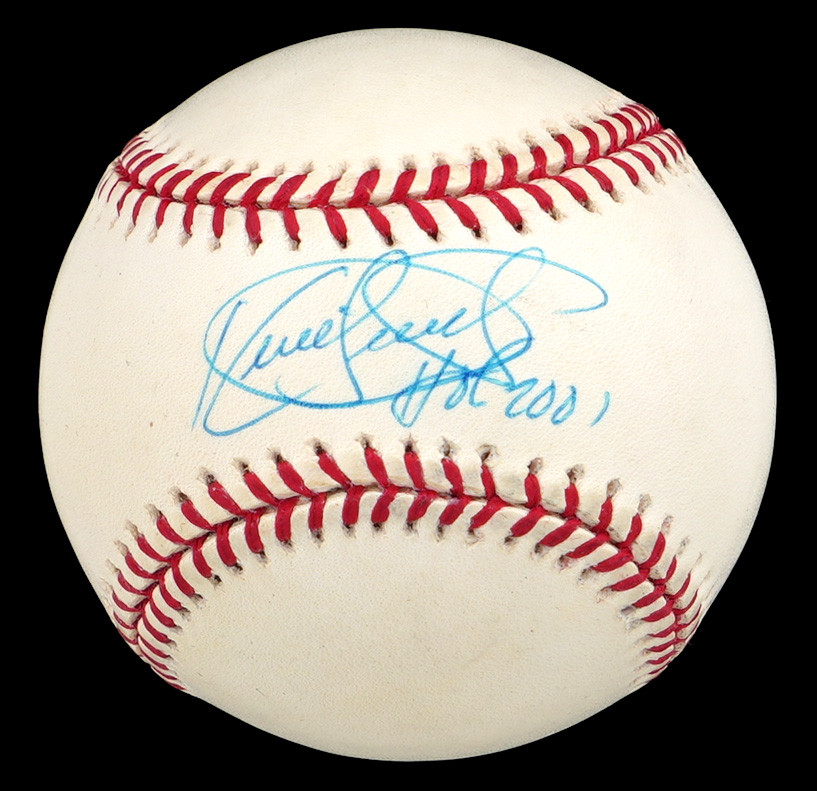 A prized Kirby Puckett signature is amplified in importance, with the addition of a tough inscription on this single-signed and inscribed baseball. After a dozen solid seasons with the Minnesota Twins, Puckett was still raking at an elite level, when his lost vision in his right eye in 1996. This vision impairment cut several years off his tremendous career, but he had already accomplished enough for the Hall of Fame voters to make him a first ballot selection for the Class of 2001. Puckett proudly included the inscription "HOF 2001", with his sweet spot signature on this bright white OAL/Budig baseball. The window for Puckett to provide this rarely seen inscription was less than five years, as he was felled on March 6, 2006, by a massive stroke. Keep your memories of Puckett strong, with the acquisition of this very attractive ball.