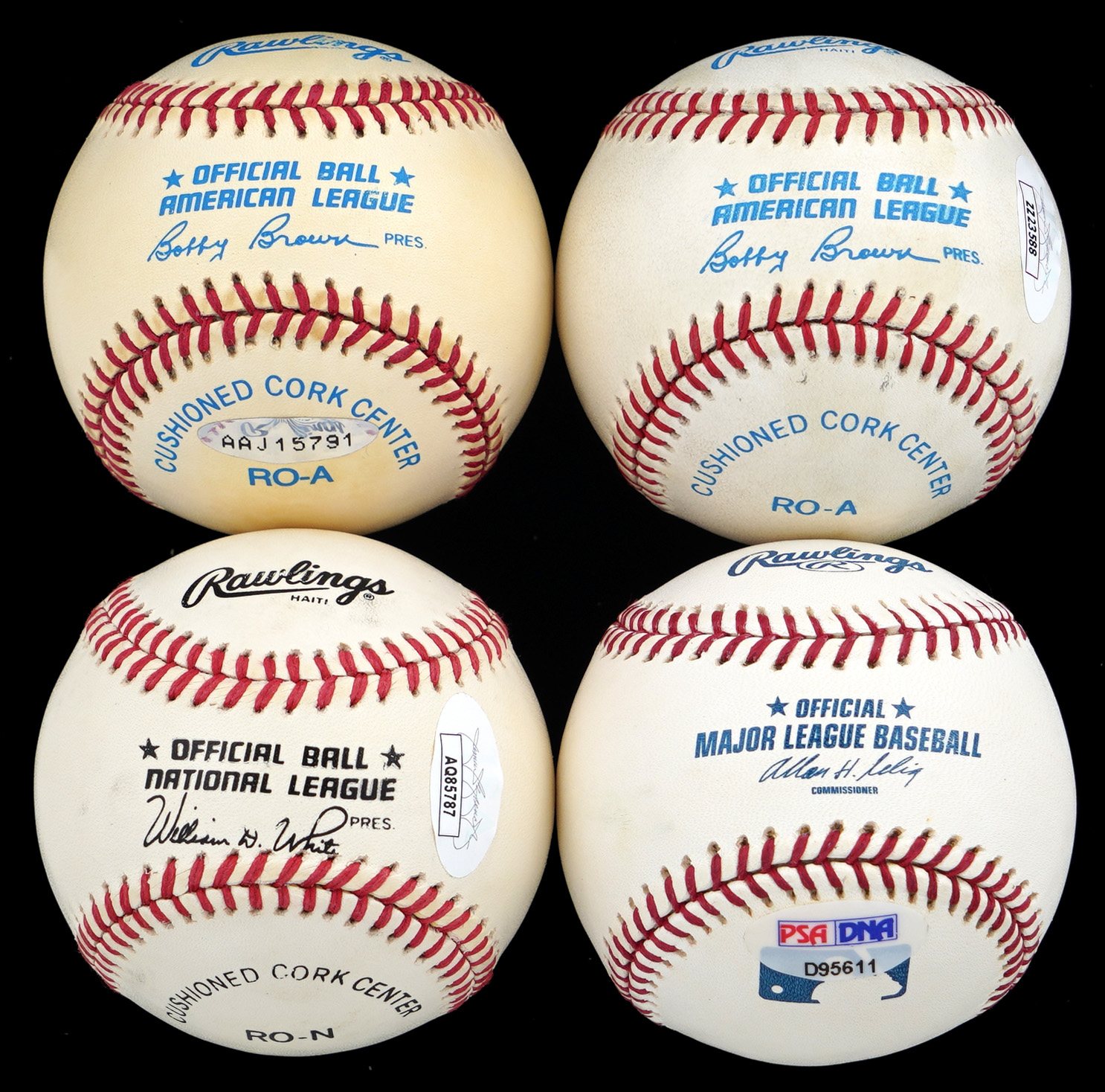 Legendary quartet of Baseball Hall of Fame single-signed baseballs. Includes: