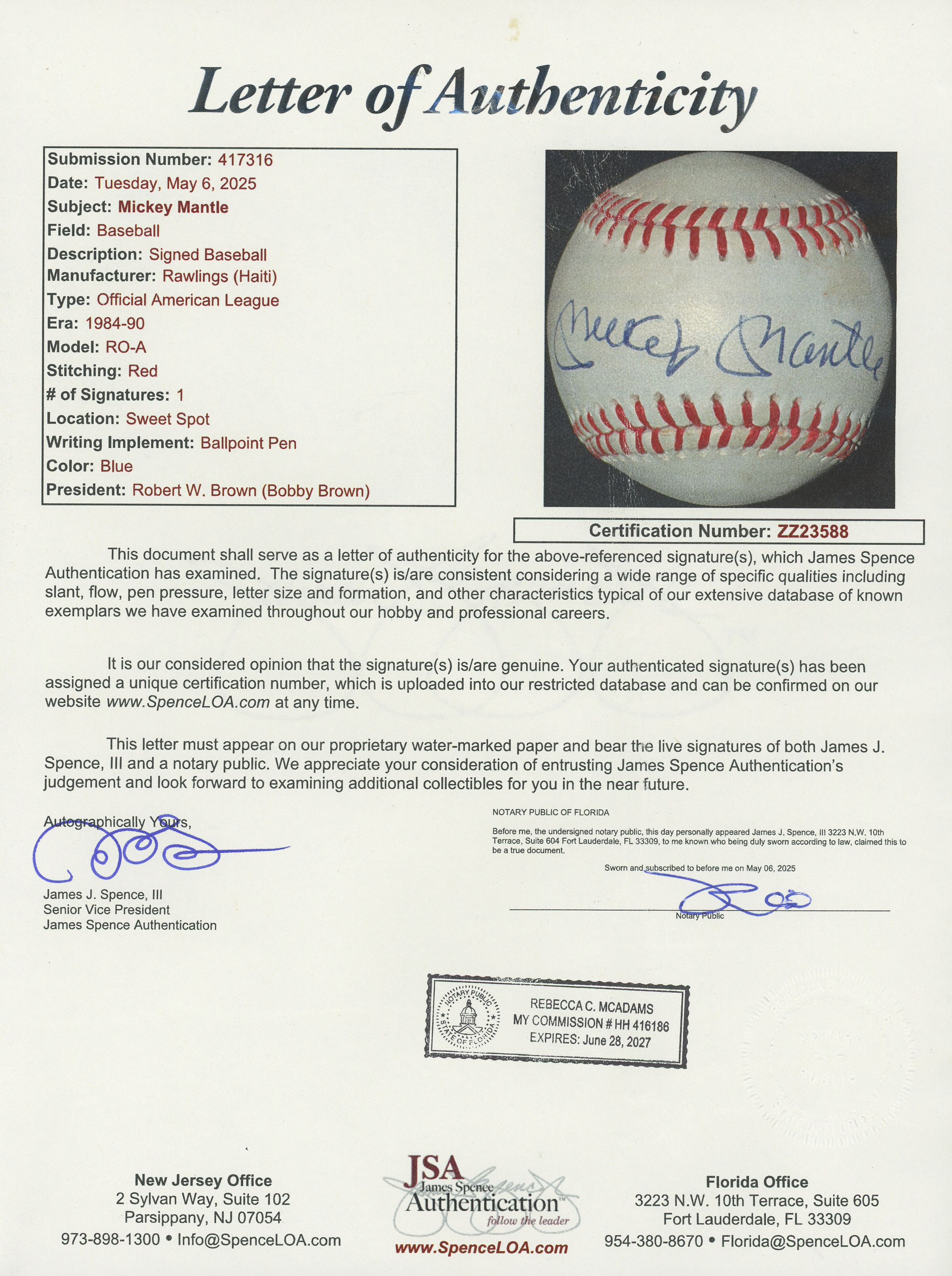 Mickey Mantle signed white OAL/Brown ball with dark (“9-10”) signature, Full LOA from James Spence/JSA.
