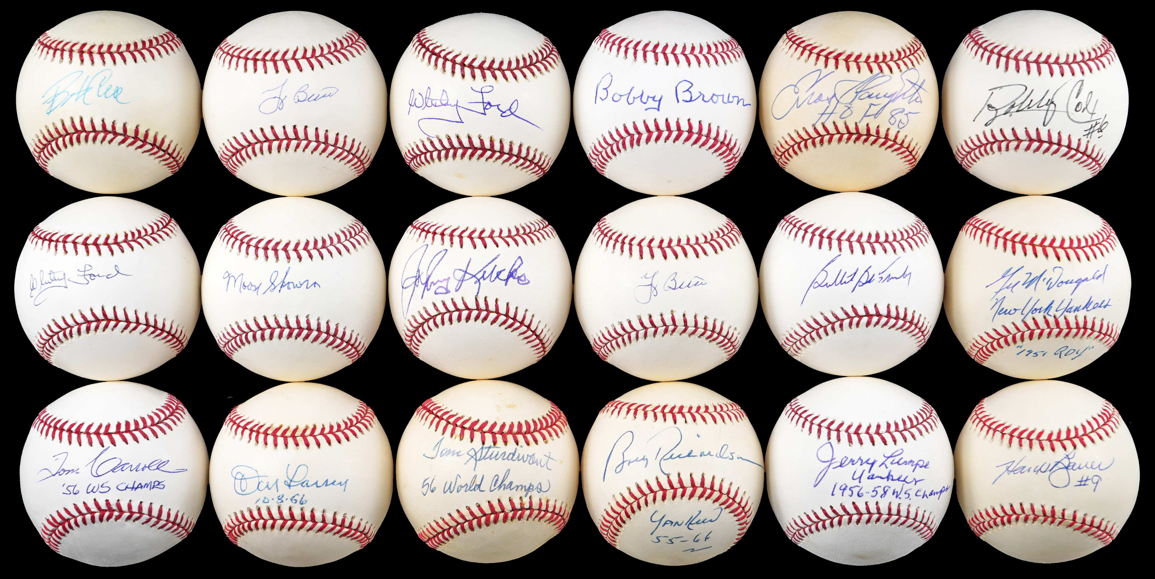 Classic New York Yankees team members have signed these (18) Official Rawlings baseballs averaging creamy white to white with (“9-10”) signatures, many with inscriptions.