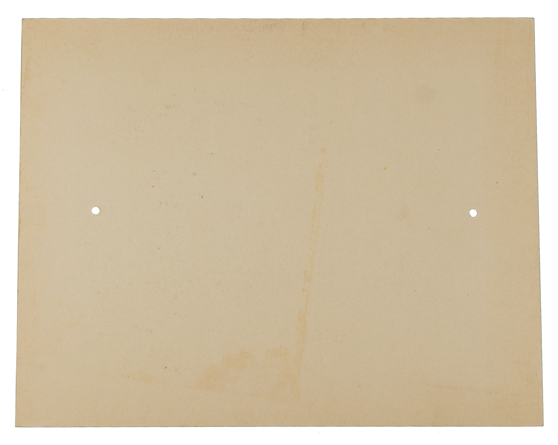 The offered sheet is not only a tremendous surviving example but also a model of aesthetics, boasting bold colors and a largely undisturbed image area. A number of small indentions are visible under close inspection originating in the middle of the Grove card and extended down to the top of the Frisch card. No creases or wrinkles affect the card area, but there is a small upper right corner crease that extends into a 5-inch long horizontal crease along the top border. The blank reverse displays some scattered toning. These small flaws could very easily be covered with pleasing matting and framing resulting in an even more extraordinary display piece.