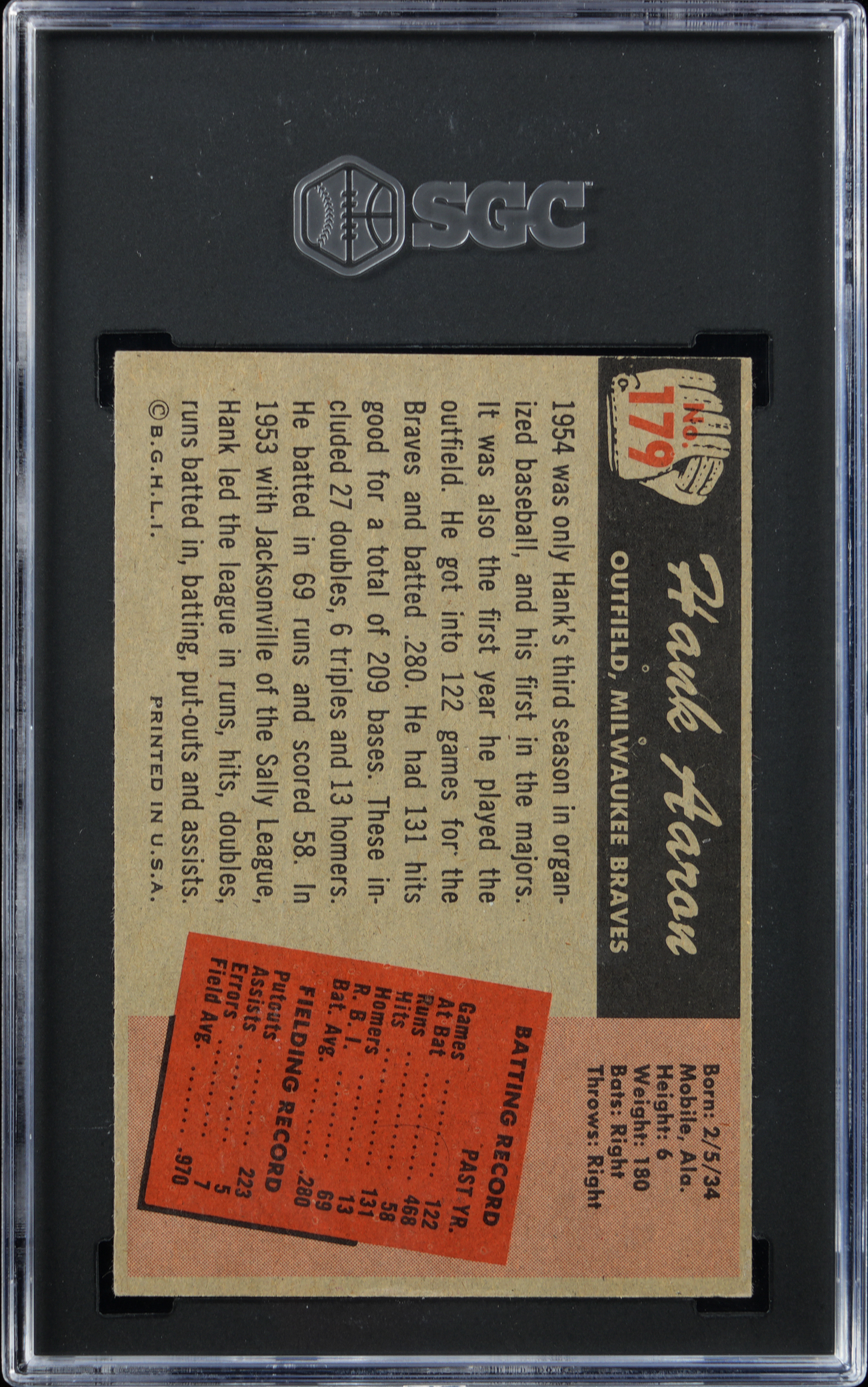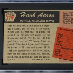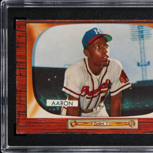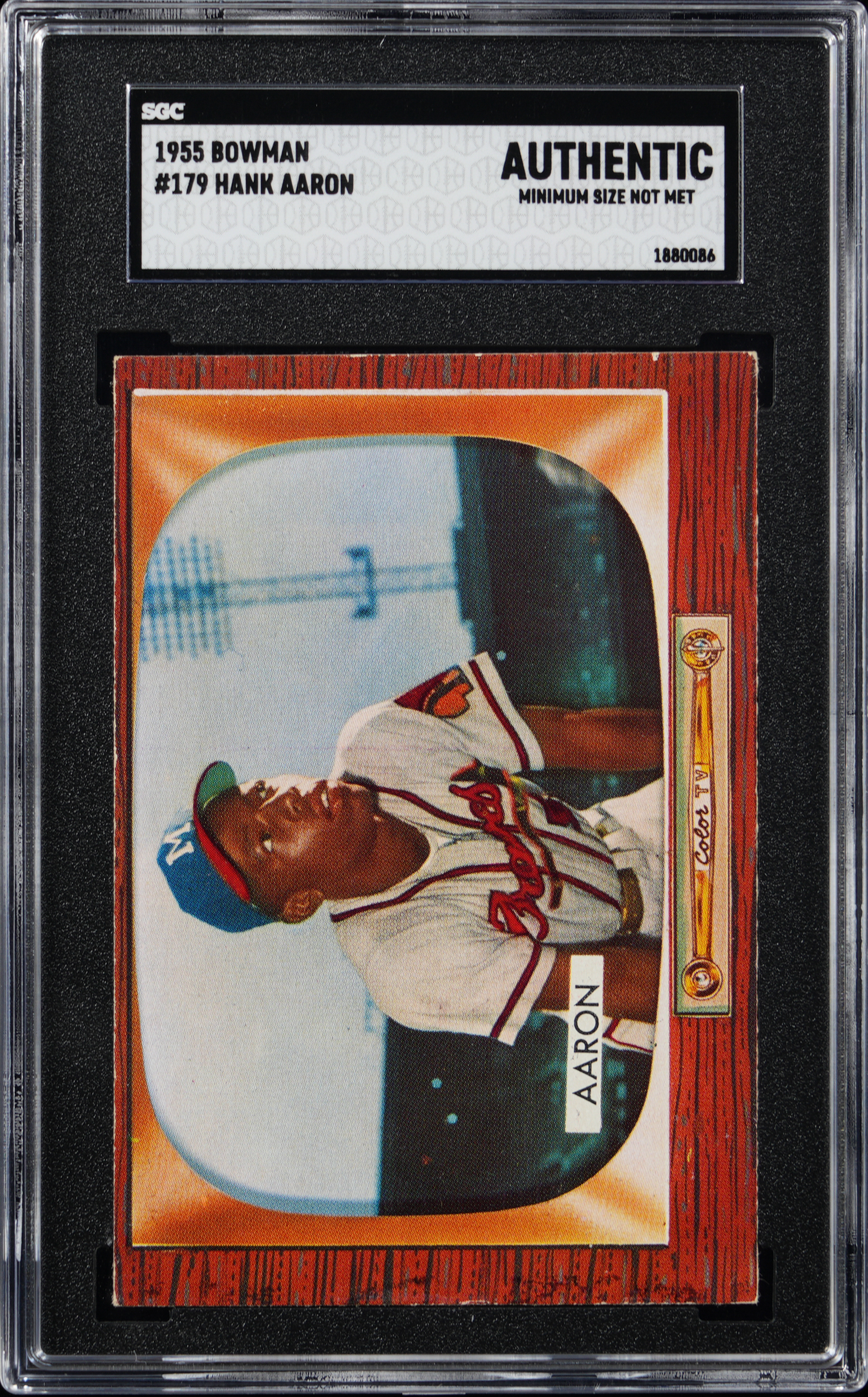 Graded Authentic by SGC due to minimum size requirements not being met. Very attractive 1955 Bowman #179 Hank Aaron single. This lone Bowman gum card of the Milwaukee Braves Hall of Famer is crease-free with brilliant surface colors and a clean back.