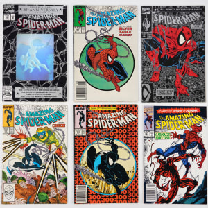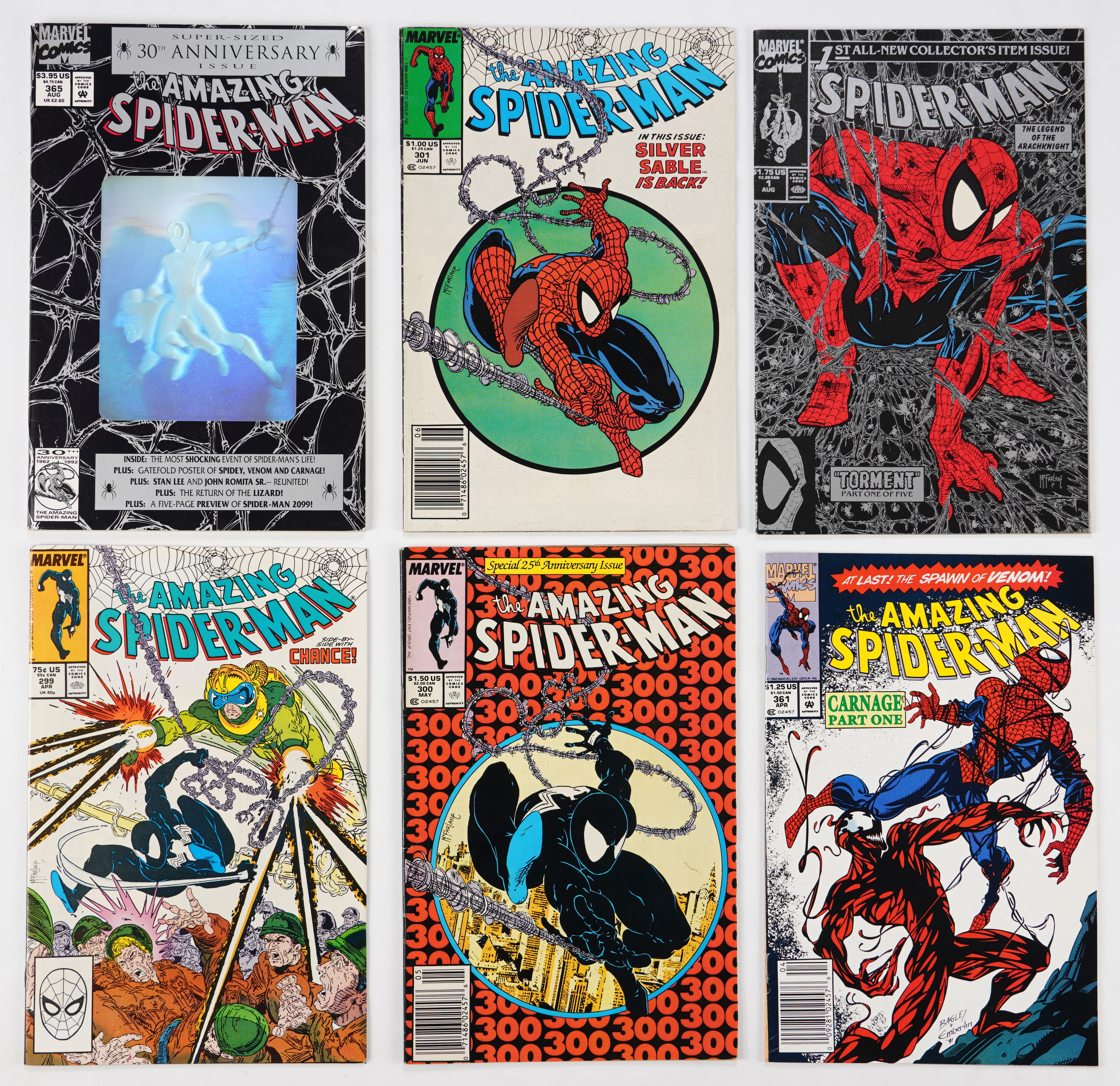Amazing Spider-Man (6): #299 first brief Venom appearance with costume VF-NM, #300 first full Venom appearance FN+, #301 classic McFarlane cover FN+, #361 first Carnage, first print FN-VF, #365 first appearance of Spider-Man 2099 FN-VF, #375 first Ann Weyring (she-Venom) VF-;