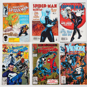 Copper Age classics come forth, with this 1980s-1990s Marvel Spider-Man comic book collection (33). Lots of great Amazing Spider-Man issues were published during this period, and this offering boasts several high-profile Copper Age books, including Amazing Spider-Man #300 with the first appearance of Venom, and #361 with the first appearance of Carnage. Backing up these alien Symbiote super-villains, are Todd McFarlane’s “Torment” arc, the stunning Black Cat, and a solo Venom book. Condition is favorable overall, with all but one issue reporting in FN to NM state.
