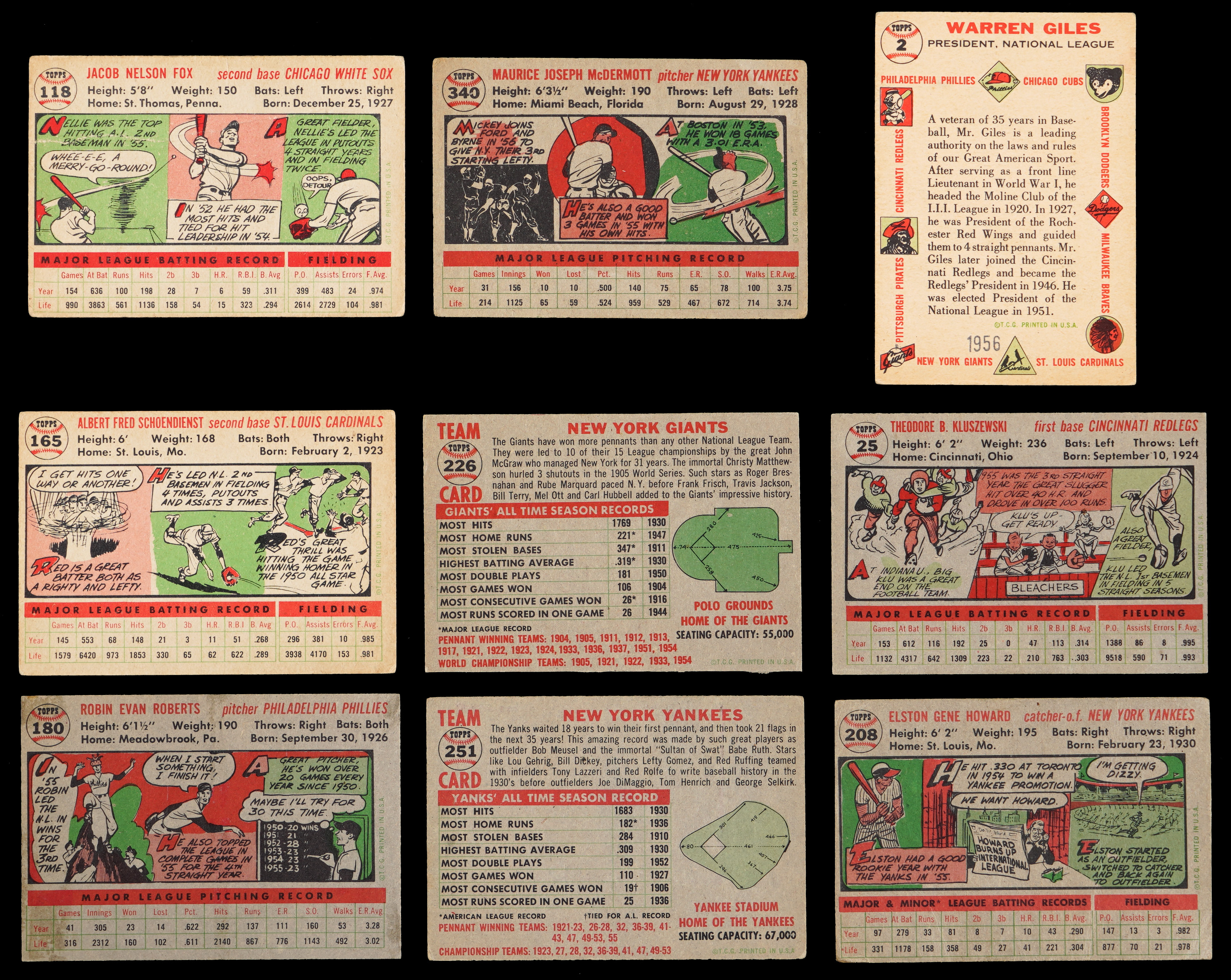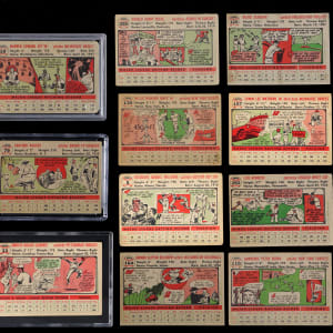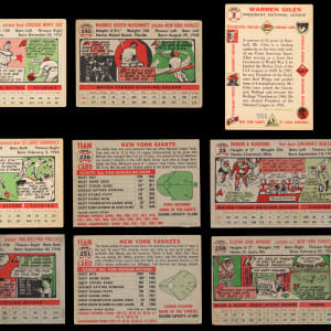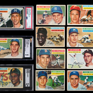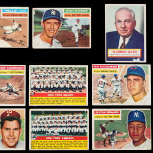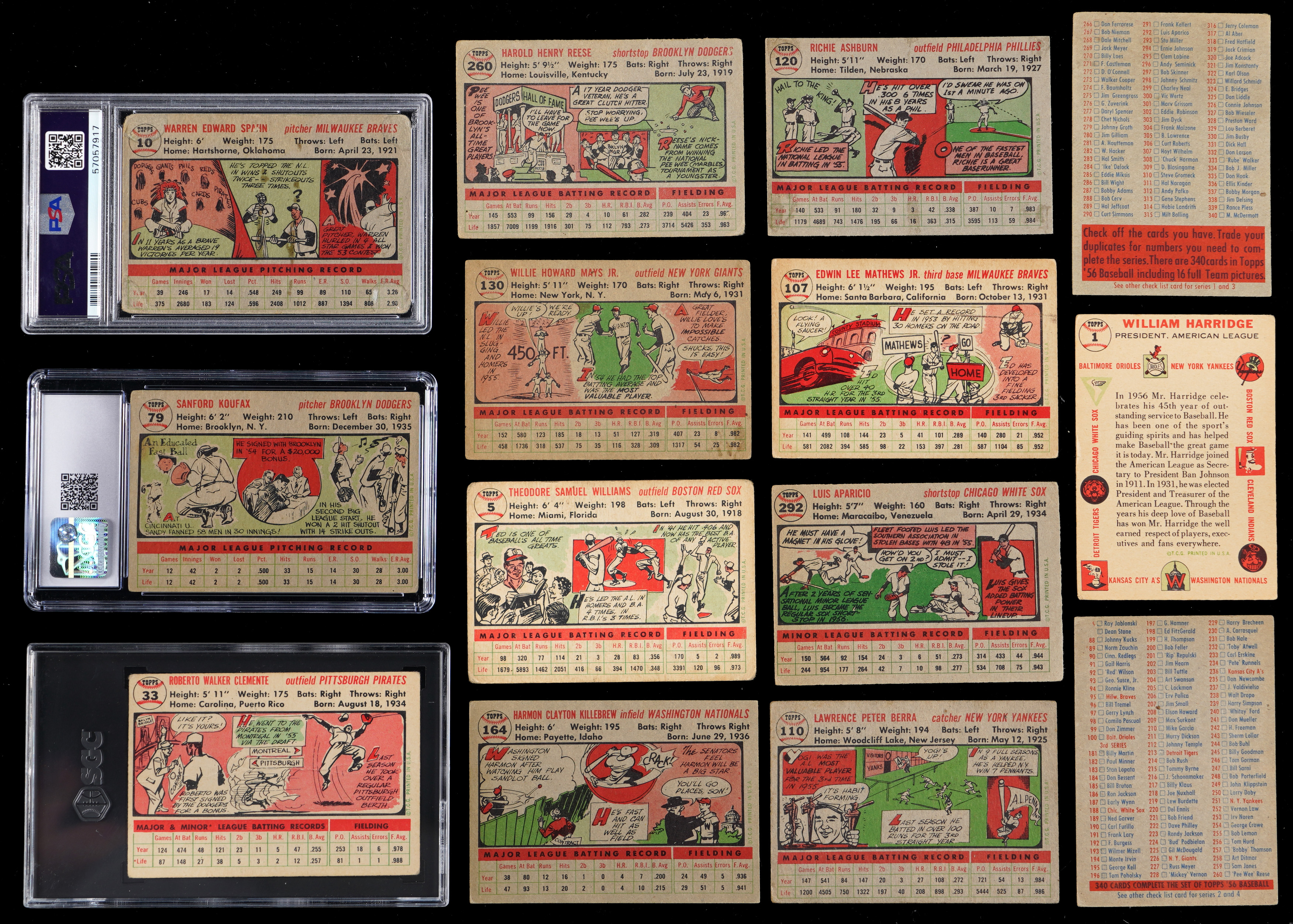 Classic 1956 Topps partial set of (193/340) cards featuring a strong core of Hall of Fame talent, five graded cards plus a pair of checklists. This mixed grade “giant size” compilation generally presents in the (GD to VG) range with nearly 10% displaying paper loss/residue, pin holes, tape, trimming and/or writing. It should be noted that several cards do fare better than the (GD to VG) range. Highlights include: #1 Harridge (GD), #2 Giles (FR, reverse stamp), #5 T. Williams (FR), #10 Spahn (PSA POOR 1), #25 Kluszewski (VG-EX), #33 Clemente (SGC POOR 1), #79 Koufax (CGC GOOD 2), #107 Mathews (FR), #110 Berra (GD), #118 Fox (PR), #120 Ashburn (EX), #130 Mays (GD), #164 Killebrew (VG-EX), #165 Schoendienst (GD), #180 Roberts (EX), #208 E. Howard (FR), #226 Giants Team (trimmed), #227 Meyer (SGC VG 3), #251 Yankees Team (GD), #260 Reese (PR, pin holes), #289 Gilliam (PSA POOR 1), #292 Aparicio RC (GD), #340 McDermott (GD), NNO CL 1/3 (erased writing) and NNO CL 2/4 (GD).
