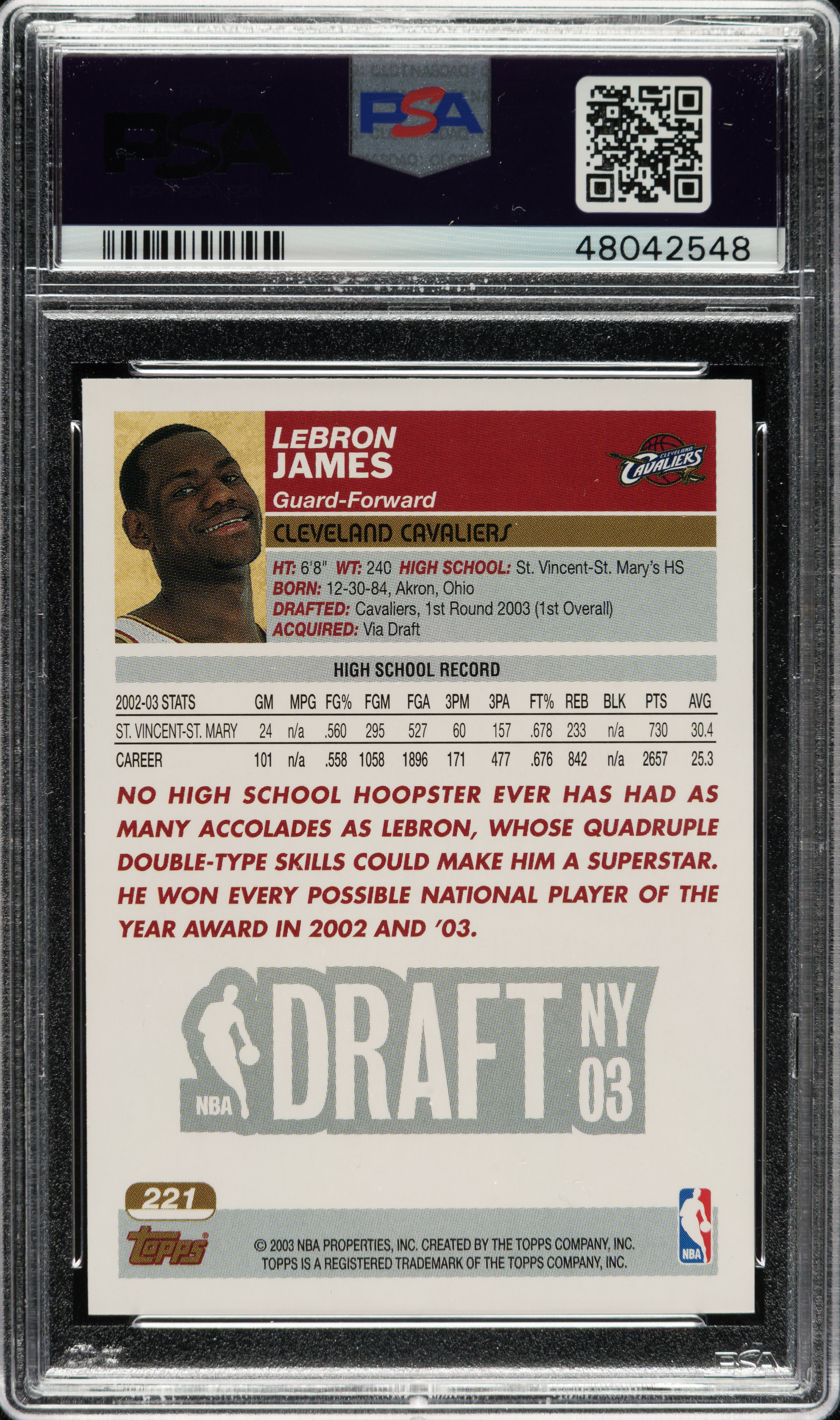 Graded GEM MINT 10 by PSA. The NBA all-time leading scorer and four-time Most Valuable Player is pictured as the #1 overall draft pick on the offered 2003-2004 Topps Basketball #221 LeBron James rookie card. This investment caliber showpiece of the Cleveland Cavaliers megastar is accurately centered with untouched corners, creamy edge edges and a flawless surface. Ranks in the upper 12% of all similar copies of the legend judged by the authenticator.