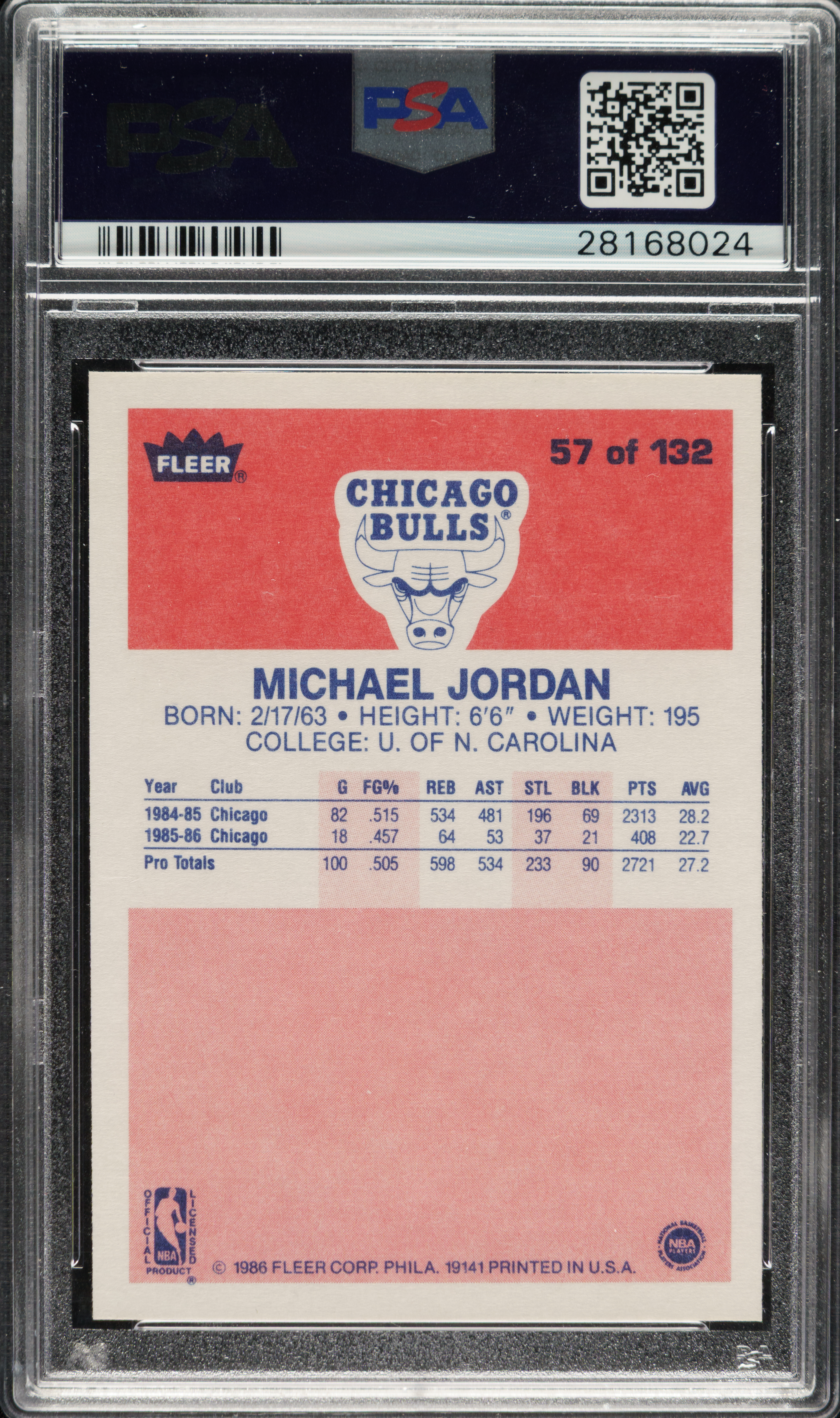 Graded MINT 9 by PSA. Strictly mint 1986-1987 Fleer Basketball #57 Michael Jordan rookie card! This majestic centerpiece showcases the NBA icon as he soars to the rim past multiple hapless New Jersey Nets onlookers. An accurately centered beauty of the Chicago Bulls legend that showcases four sharp corners, unchipped edges and dynamic surface colors. A tremendous example of this desirable modern basketball classic!