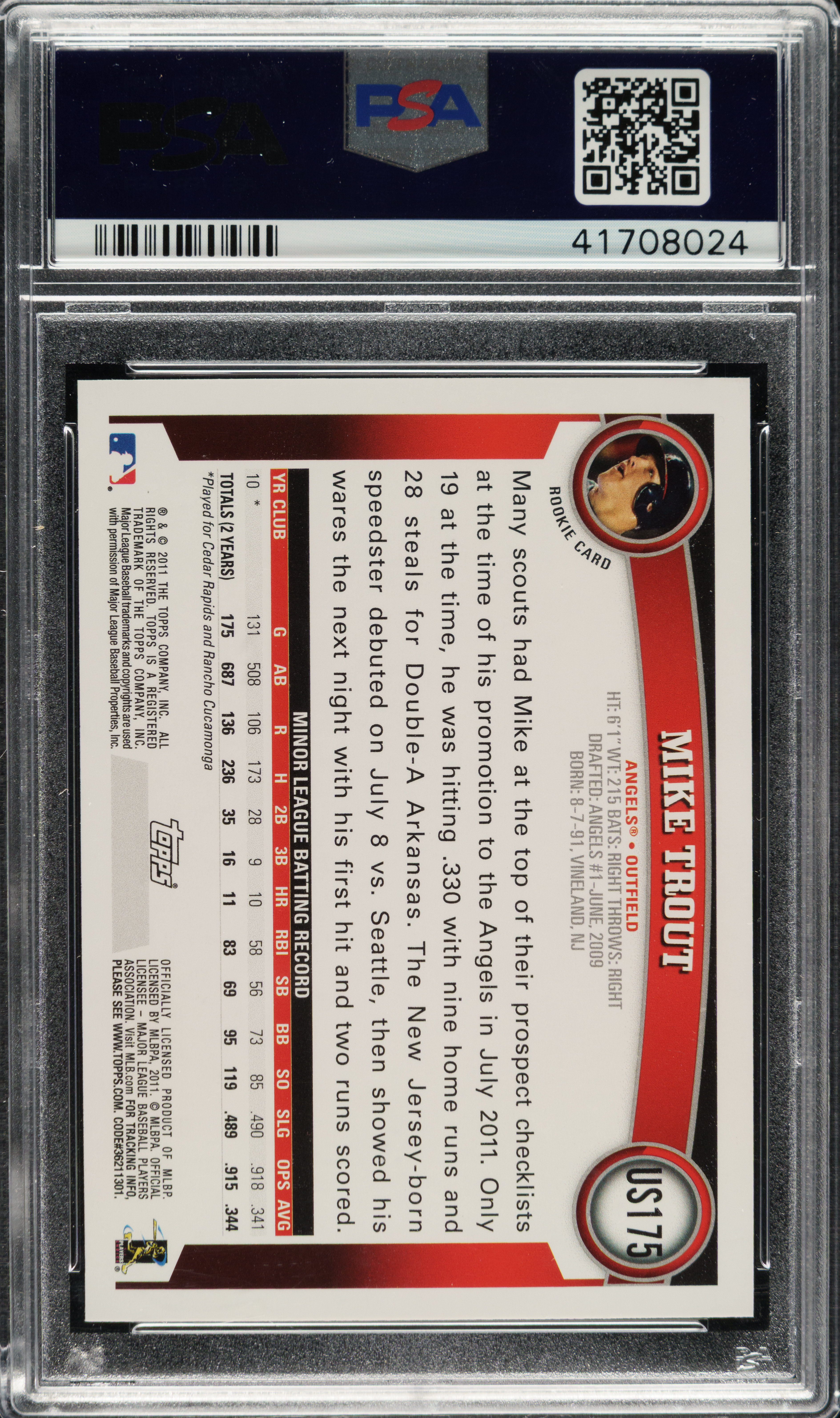 Graded GEM MINT 10 by PSA. Standout 2011 Topps Update #175 Mike Trout rookie card picturing the Los Angeles Angels slugger following through on his lethal swing. This sure-fire Hall of Famer is one of the most recognizable cards of the decade!