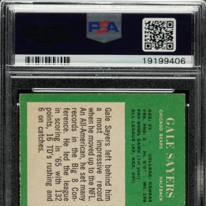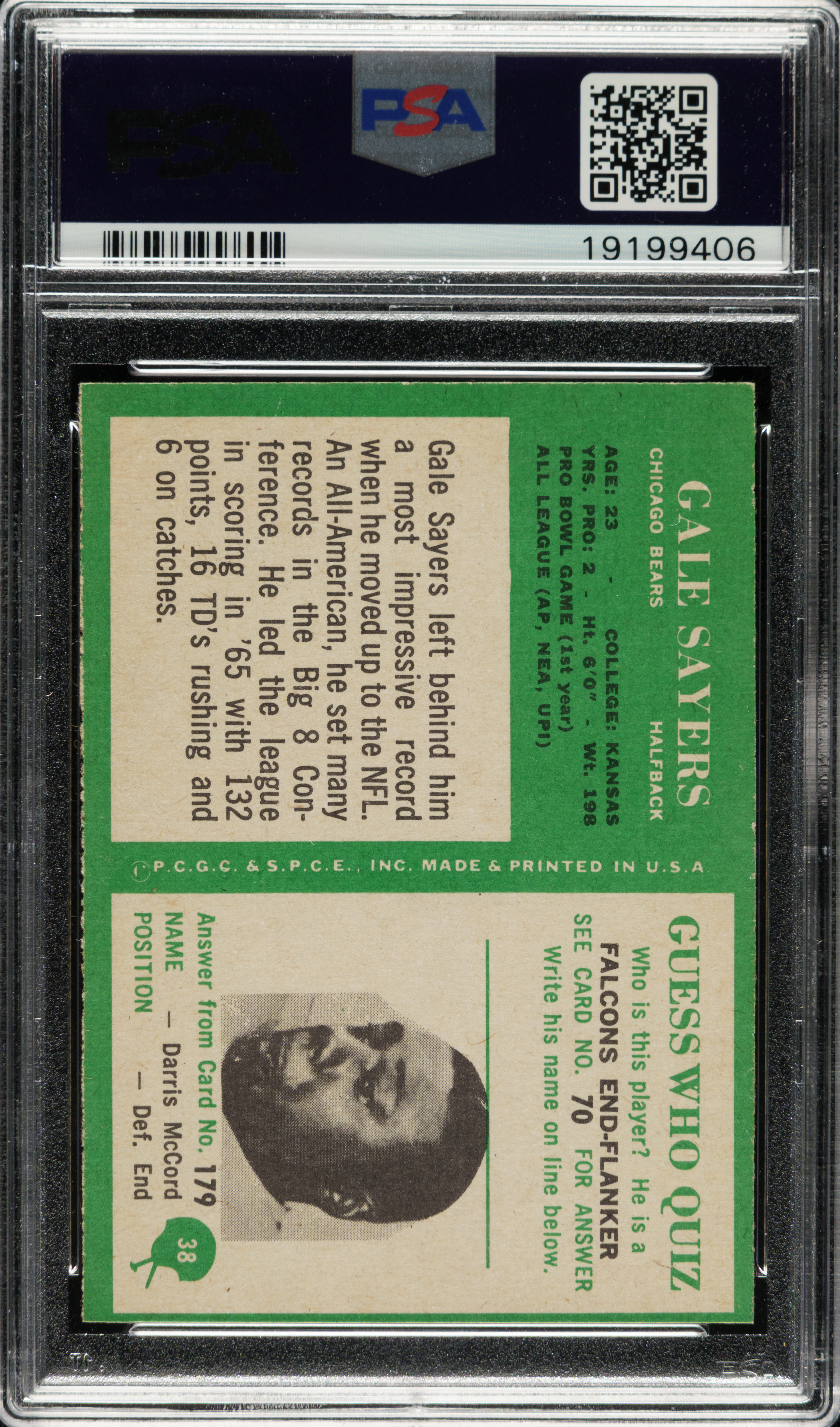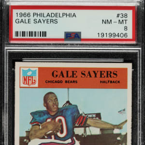 Graded NM-MT 8 by PSA. This electric 1966 Philadelphia Gum Football #38 Gale Sayers portrays the "Kansas Comet" at the dawn of his prolific (but brief) career. Showcases factory crisp corners/edges, accurate centering and blistering surface colors. The Chicago Bears Hall of Famer's reverse is clean. Ranks in the upper 11% of all similar copies validated by the grading service.