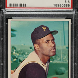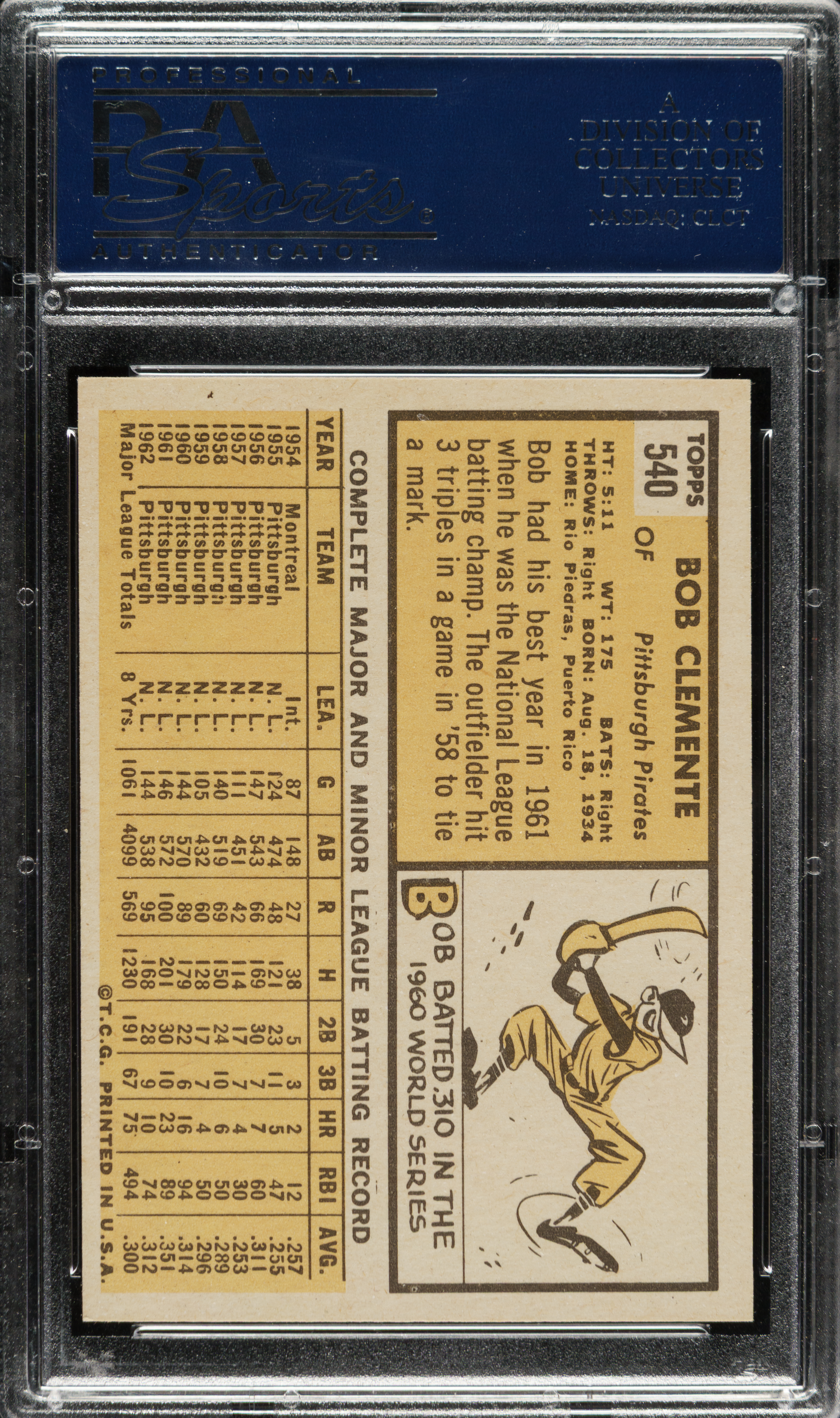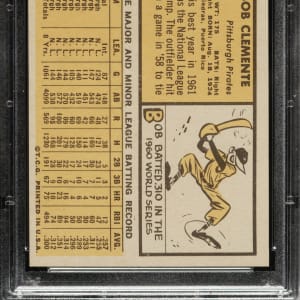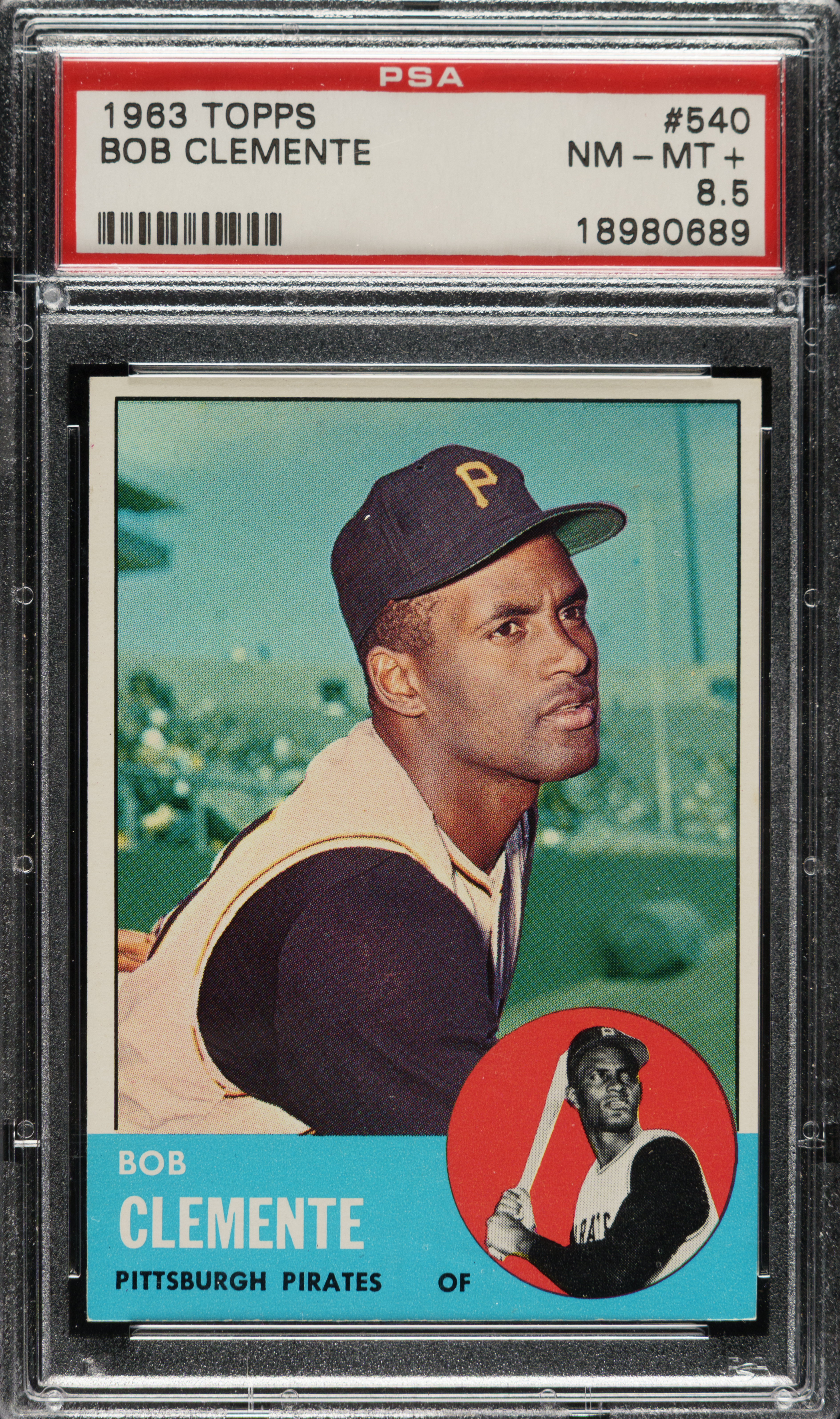 PSA Registry Collectors! Graded NM-MT+ 8.5 by PSA. Those with a discerning eye for overall quality will be well pleased with the offered 1963 Topps #540 Roberto Clemente. This virtually untouched high number of the Pittsburgh Pirates Hall of Famer is simply breathtaking by showcasing accurate centering, well-formed corners, flawless two-color edges and pinpoint surface registration. The reverse which detail's the Bucs superstar's batting record is problem-free with bold text. A true blazer that ranks in the upper 1.6% of all similar copies evaluated by the authenticator.