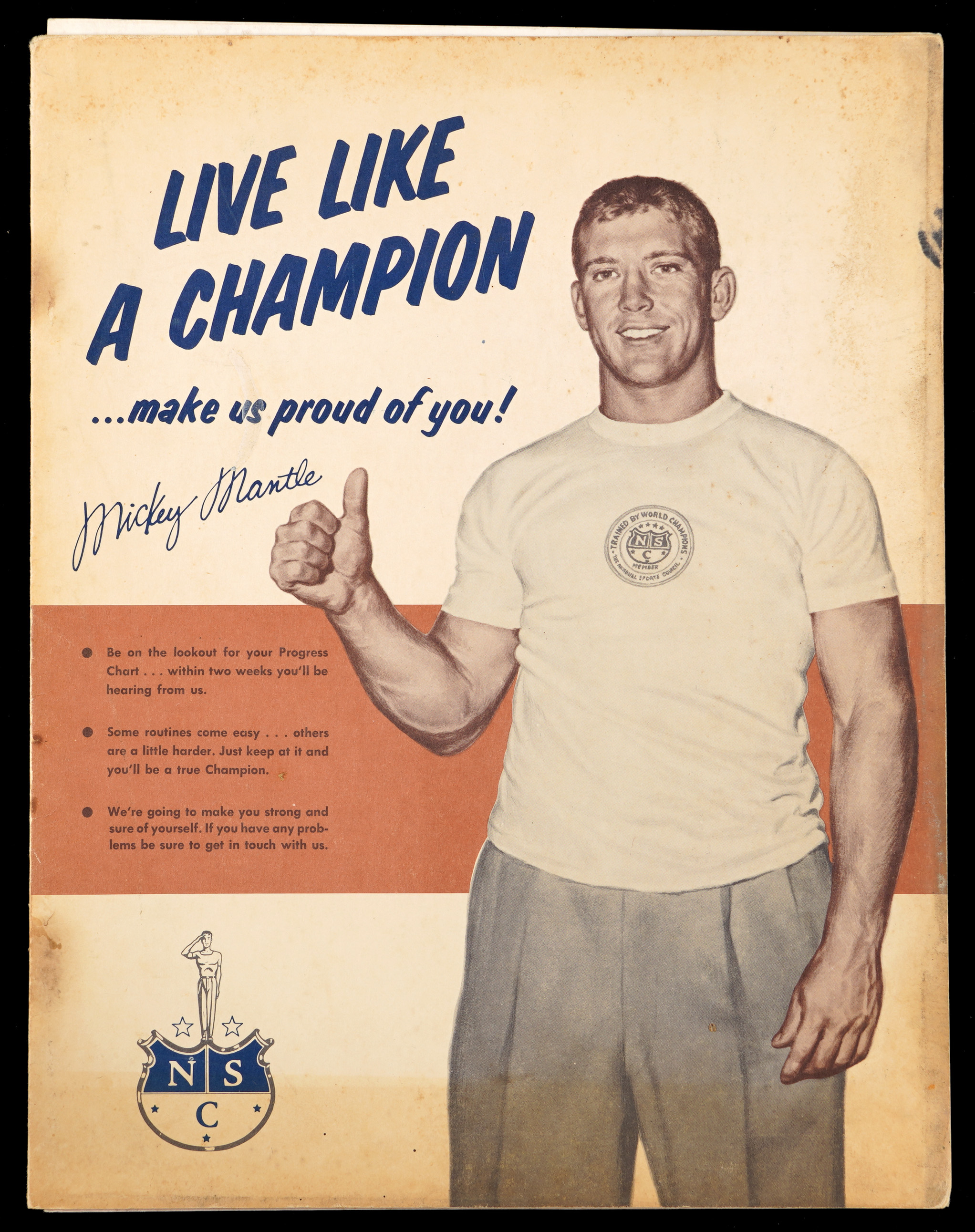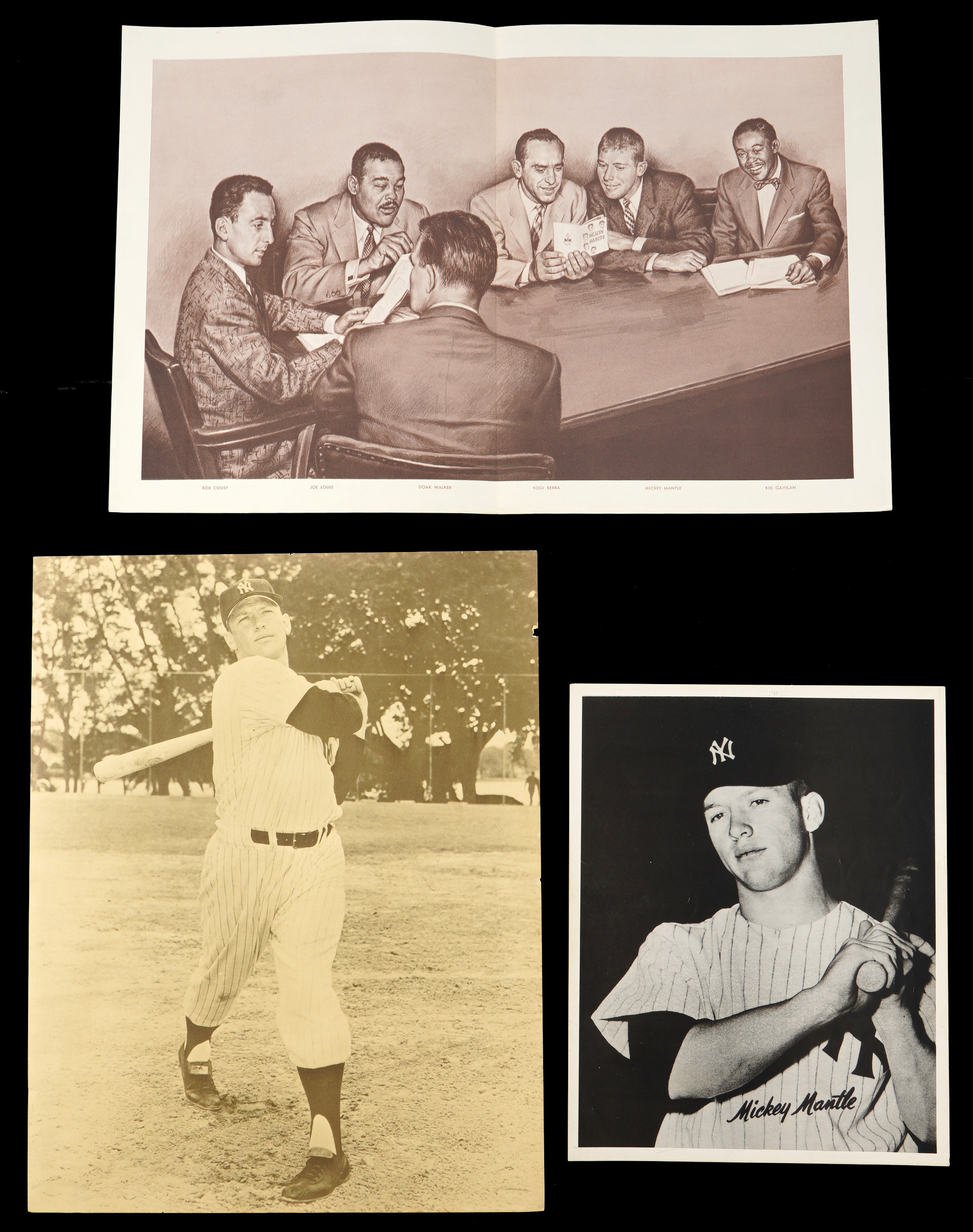 The National Sports Councils “Live Like a Champion” program from 1958 used a promotional physical fitness training kit featuring Mickey Mantle. The 11x14 folder with “The Mick” on the cover has 6 pieces in all (inside pieces are Excellent or better, cover is VG-EX). Includes a training program on the inside with Yogi Berra, Bob Cousy, Doak Walker and Joe Lewis. The folder includes a fold-out picture of Mantle and the other (4) athletes at a table with an official of the council, a large photo of Ted Kluzewski, as well as a certificate of completion for “the Manly Art of Sports.” Also included is a large 11x14 paper premium photo (VG-EX) of Mantle in full swing, and a glossy 8x10 premium photo of Mantle with an embossed script name (EX).