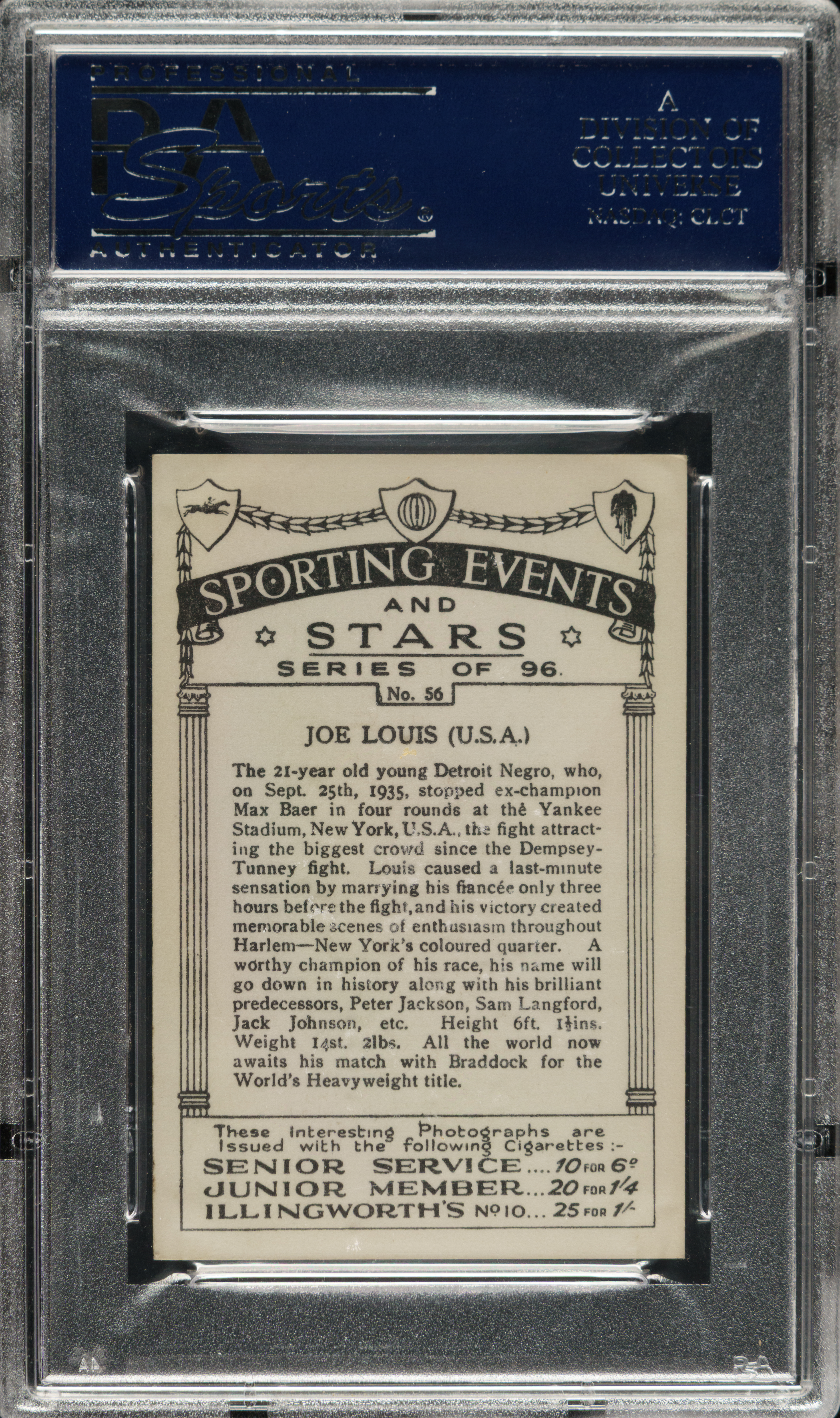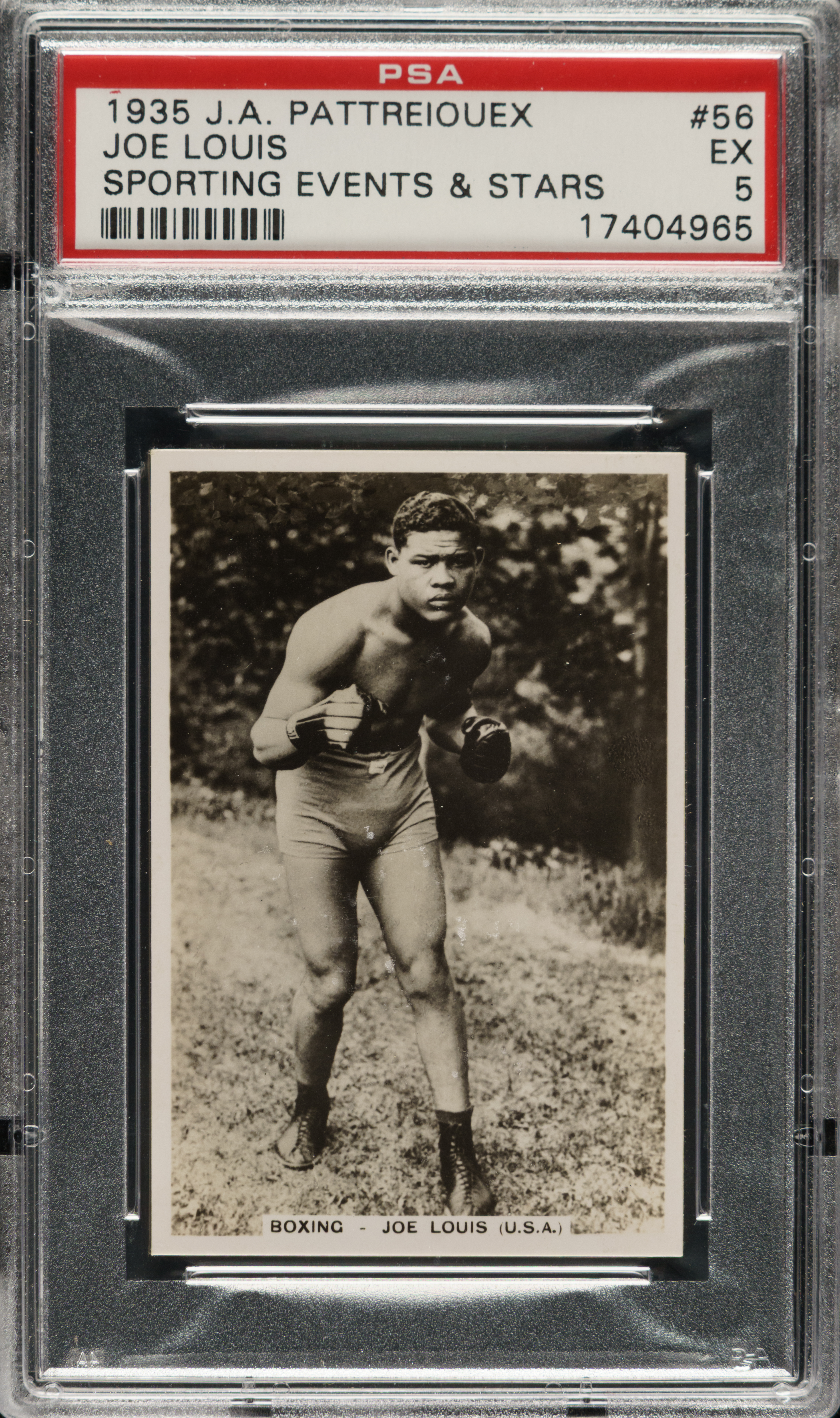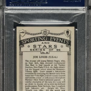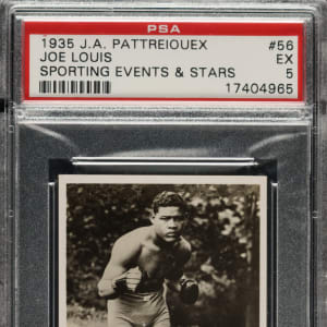 Graded EX 5 by PSA. "The Brown Bomber" shows perfect fighting form on the offered 1935 J.A. Pattreiouex Sporting Events & Stars #56 Joe Louis single. A knockout black-and-white image of the legendary heavyweight champ.