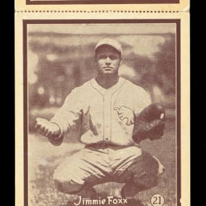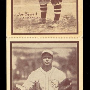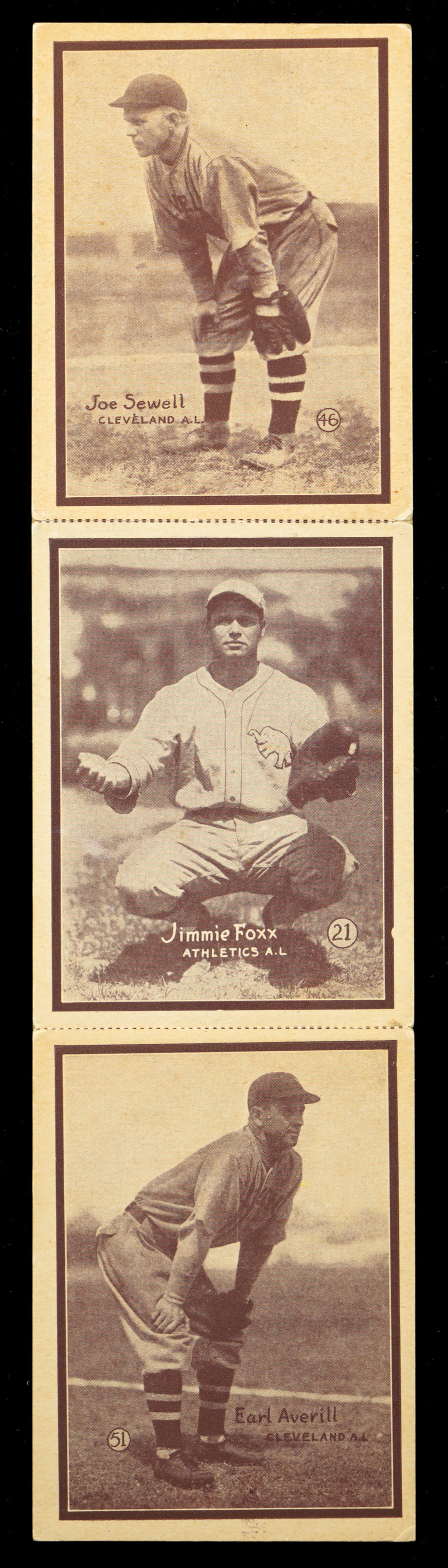 Incredibly scarce 1931 W517 three-card panel featuring Hall of Famers #46 Joe Sewell (top), #21 Jimmie Foxx (center) and #51 Earl Averill (bottom). Originally produced as vertical three-card strips, very few examples have endured the past century in such uncut condition! Measures overall 11-5/8 x 3-7/8" dimensions with stressed, but intact perforations. The sepia fronts are crease-free with only moderately rounded corners and focused registration. The blank reverse is mostly clean with only a moderate contusion on the lower right corner of the #46 Joe Sewell card. Fortunately, for fans of "The Beast," Philadelphia Athletics superstar Jimmie Foxx has escaped any serious detractors.