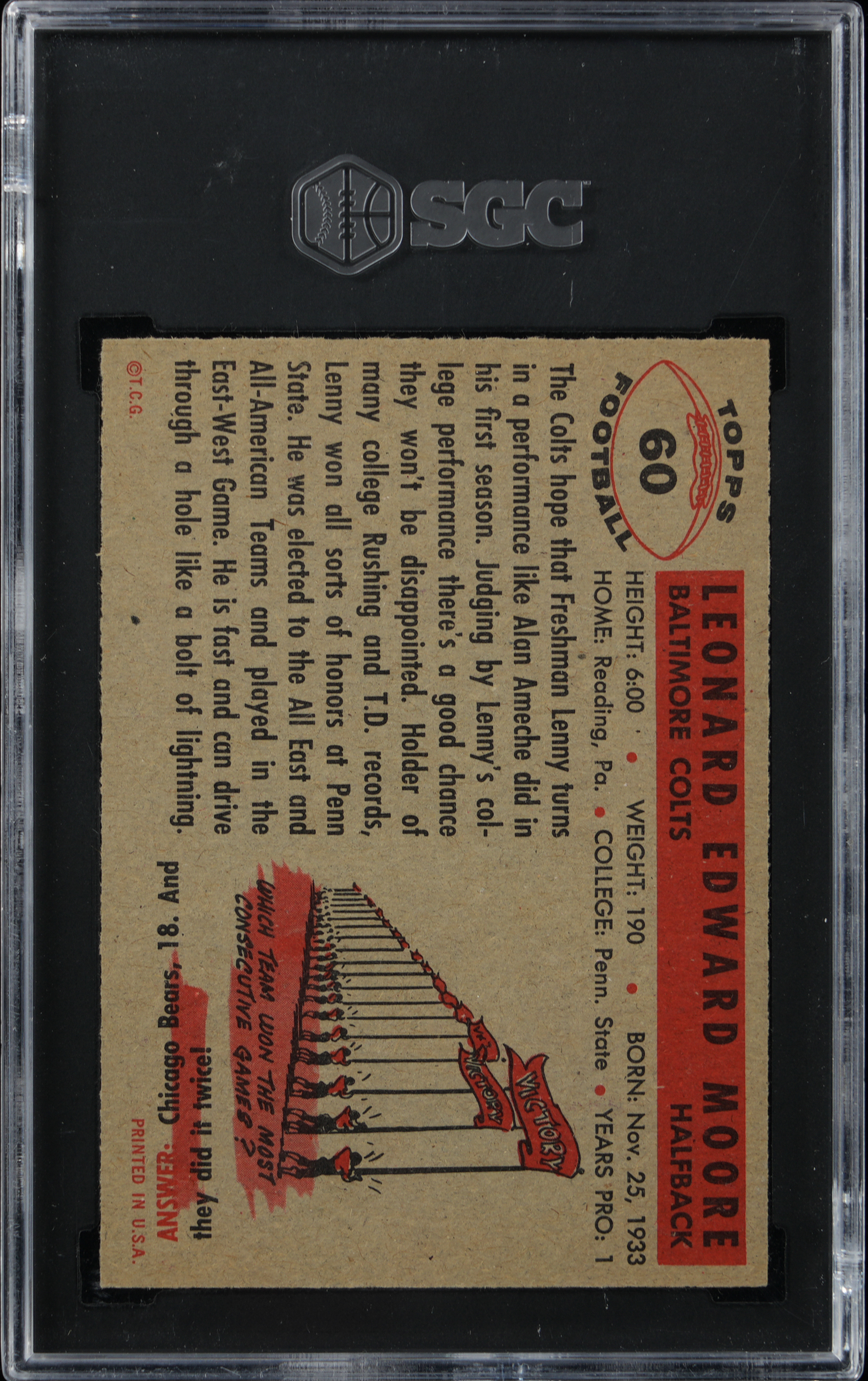 Graded NM+ 7.5 by SGC. Baltimore Colts Hall of Fame running back Lenny Moore. Shortprint.