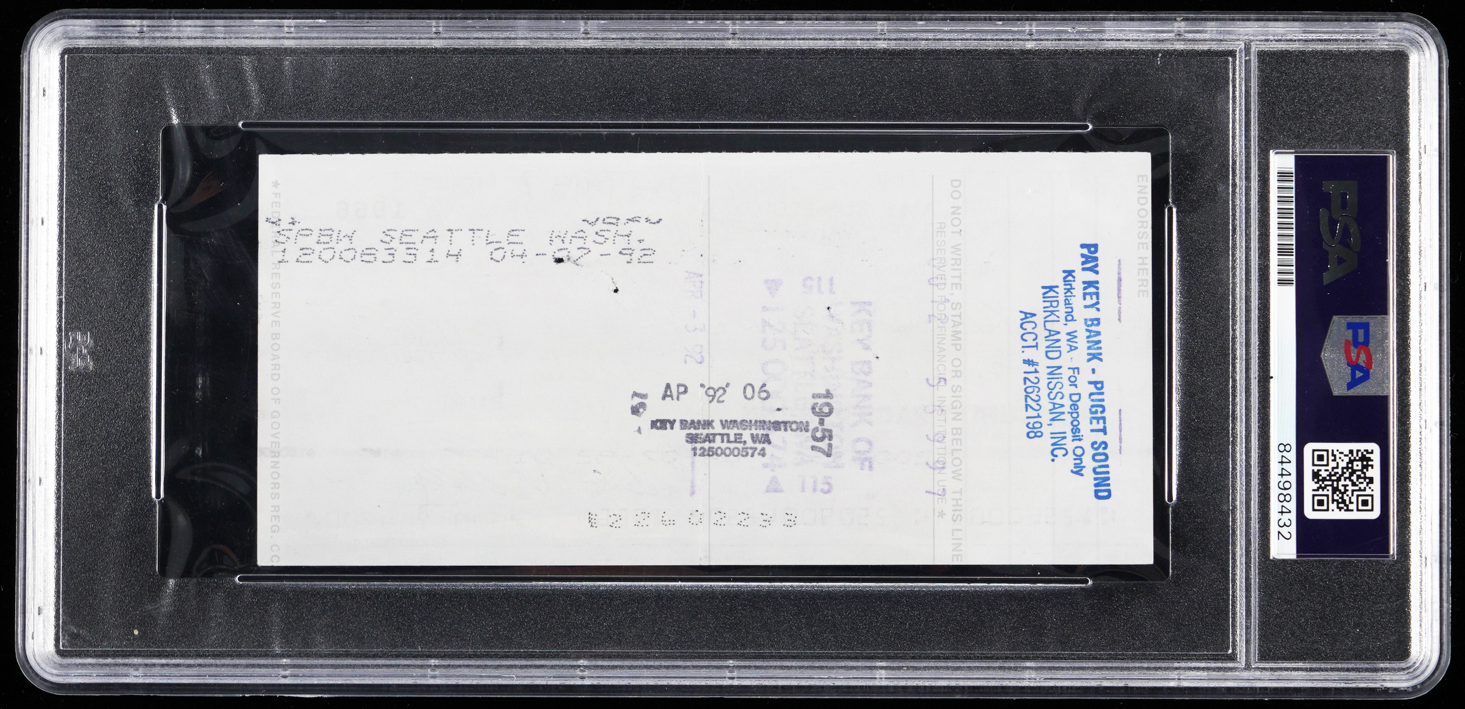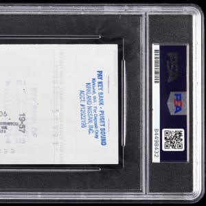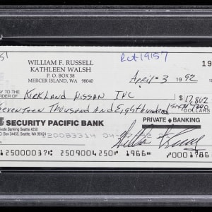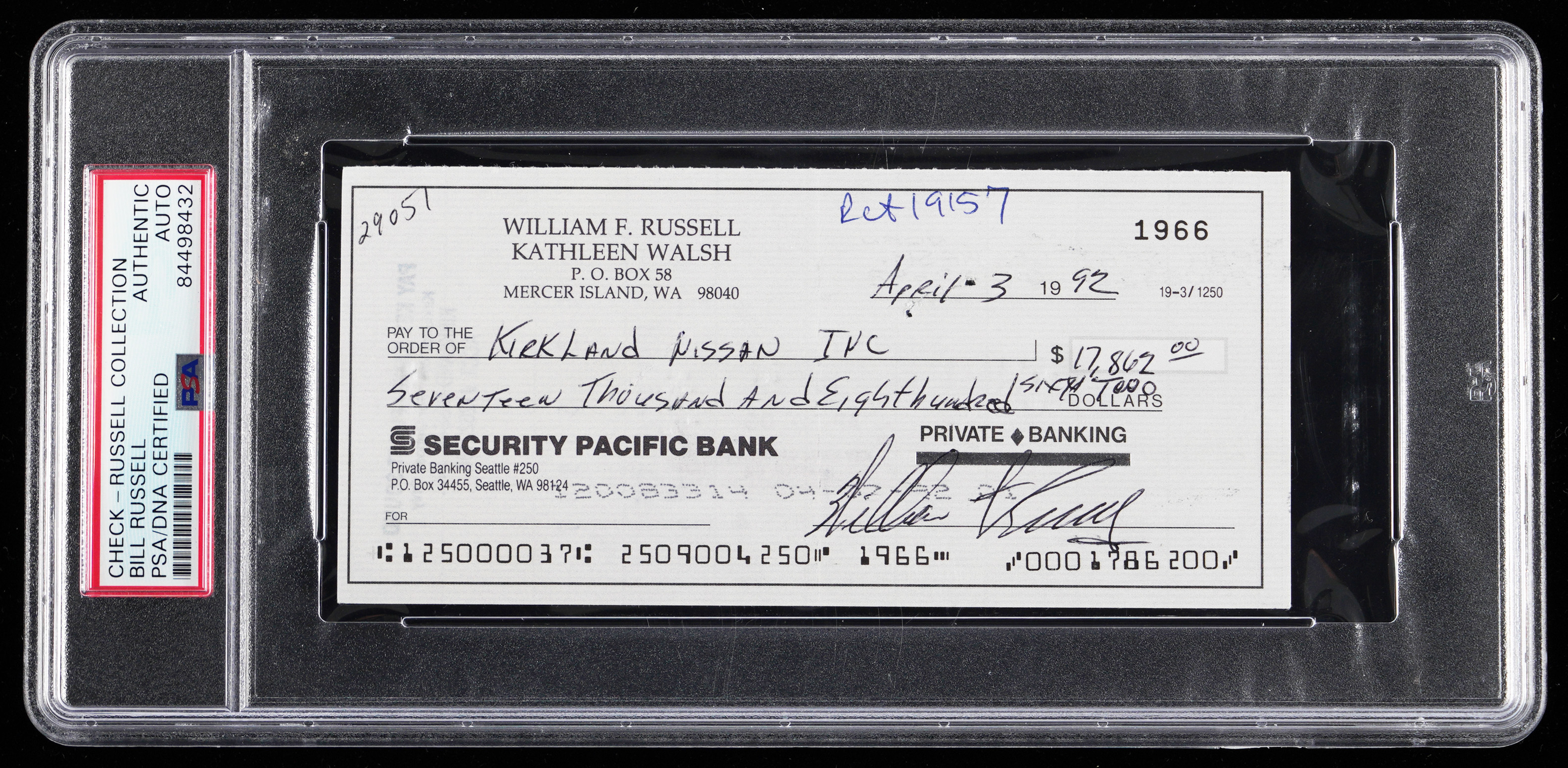 Signature judged Authentic by PSA/DNA and encapsulated by the service. It appears to be a brand new car for Boston Celtics Hall of Fame legend Bill Russell as indicated by this dated 1992 personal check. The check is paid to a Washington stated-based Nissan dealership with the big man using his given name as an endorsement. The black ink writing is clear and legible.