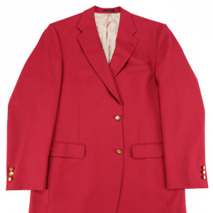 Sportscoat jacket in Cardinals Red with Jerry Ryan of Omaha, Nebraska label over the interior pocket, has gold tone buttons featuring a crest with a bear atop crossed golf clubs. Gibson hosted the Bob Gibson All-Star Classic golf tournament for twelve years, raising money for charity, and it’s a good bet he wore this jacket at the Tiburon Golf Club clubhouse.