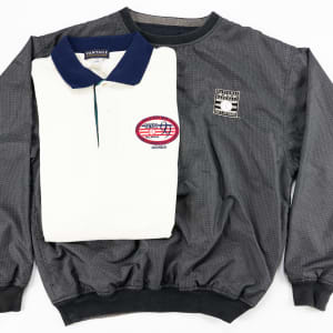 White short-sleeve shirt with navy blue accents has a “Vantage Custom Classics” label and a size “XL” tag inside the collar. Located on the left breast is a 1999 Hall of Fame induction ceremony patch with the names Brett, Cepeda, Chylak, Ryan, Selee, Williams, and Yount around the perimeter.