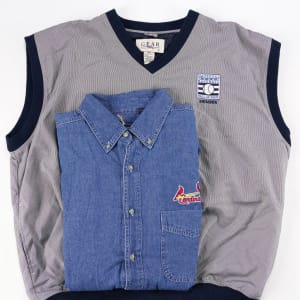 Blue denim long-sleeve shirt size “XL” with Blue Generation label inside the collar has a vibrant Cardinals logo above the left breast pocket.