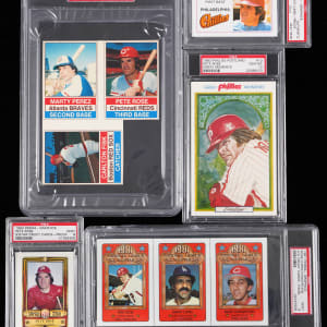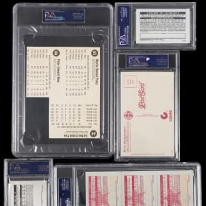 Highest Graded Collection! Each graded by PSA. For the ultimate Pete Rose die-hard arrives this eclectic group of (5) 1976-1983 oddball items. Includes: 1976 Hostess #64-66 "L" panel with #64 Fisk (PSA NM-MT 8, population 3), 1981 Perma-Graphics All-Star Credit Cards panel (PSA MINT 9, population 1), 1981 Perma-Graphics Superstar Credit Card-Proof (PSA Authentic, population 5), 1983 Perma-Graphics Superstar Credit Cards-Proof (PSA MINT 9, population 1) and 1983 Phillies Postcard Great Moments #13 (PSA GEM MINT 10, population 8).