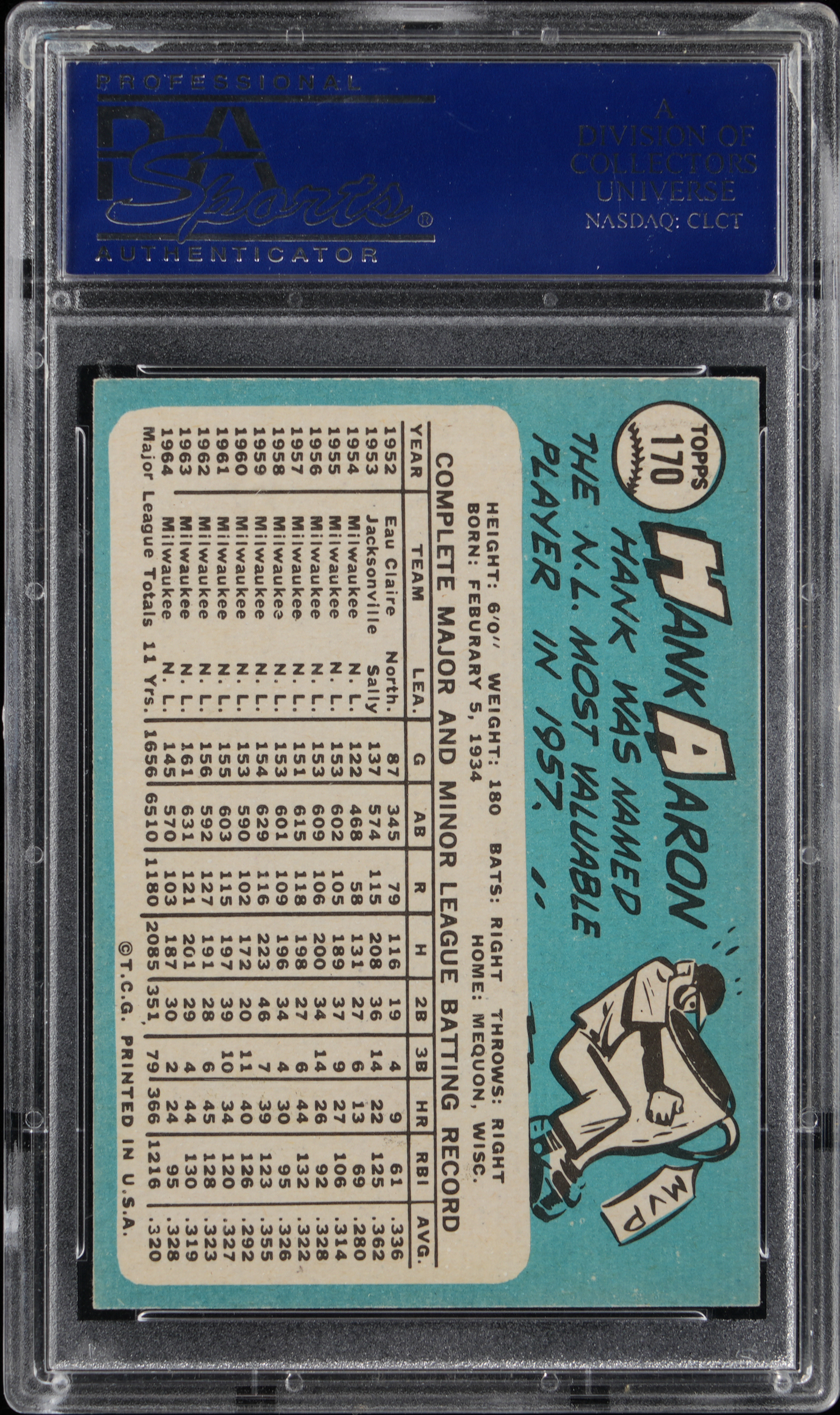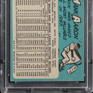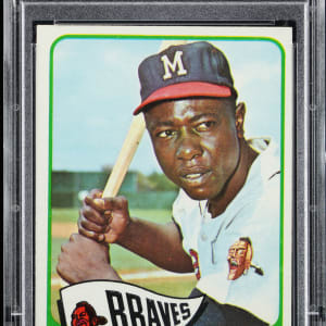 Graded NM-MT 8 by PSA. Henry (Hank) Aaron is pictured during his final season as a Milwaukee Brave on the offered 1965 Topps #170 single. This high-grade superstar survives in the upper 12% of all similar cards judged by the grading service.