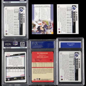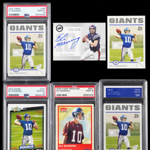 Does a Hall of Fame yellow jacket await two-time Super Bowl winner Eli Manning? Regardless of the answer, these (6) rookie cards of the New York Giants star quarterback will certainly attract significant bidding interest. Includes: Graded: (4 cards) with 2004 Fleer Tradition #331 RC (PSA MINT 9), 2004 Score #371 RC (PSA GEM MINT 10), (2) 2004 Topps #350 RC (one PSA GEM MINT 10, one IGX GEM MINT 10); Ungraded: (2 cards, both NM-MT) with 2004 Press Pass certified autograph (#/200, Auto "10") and 2004 Topps #350 RC.
