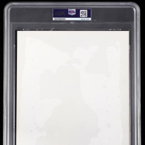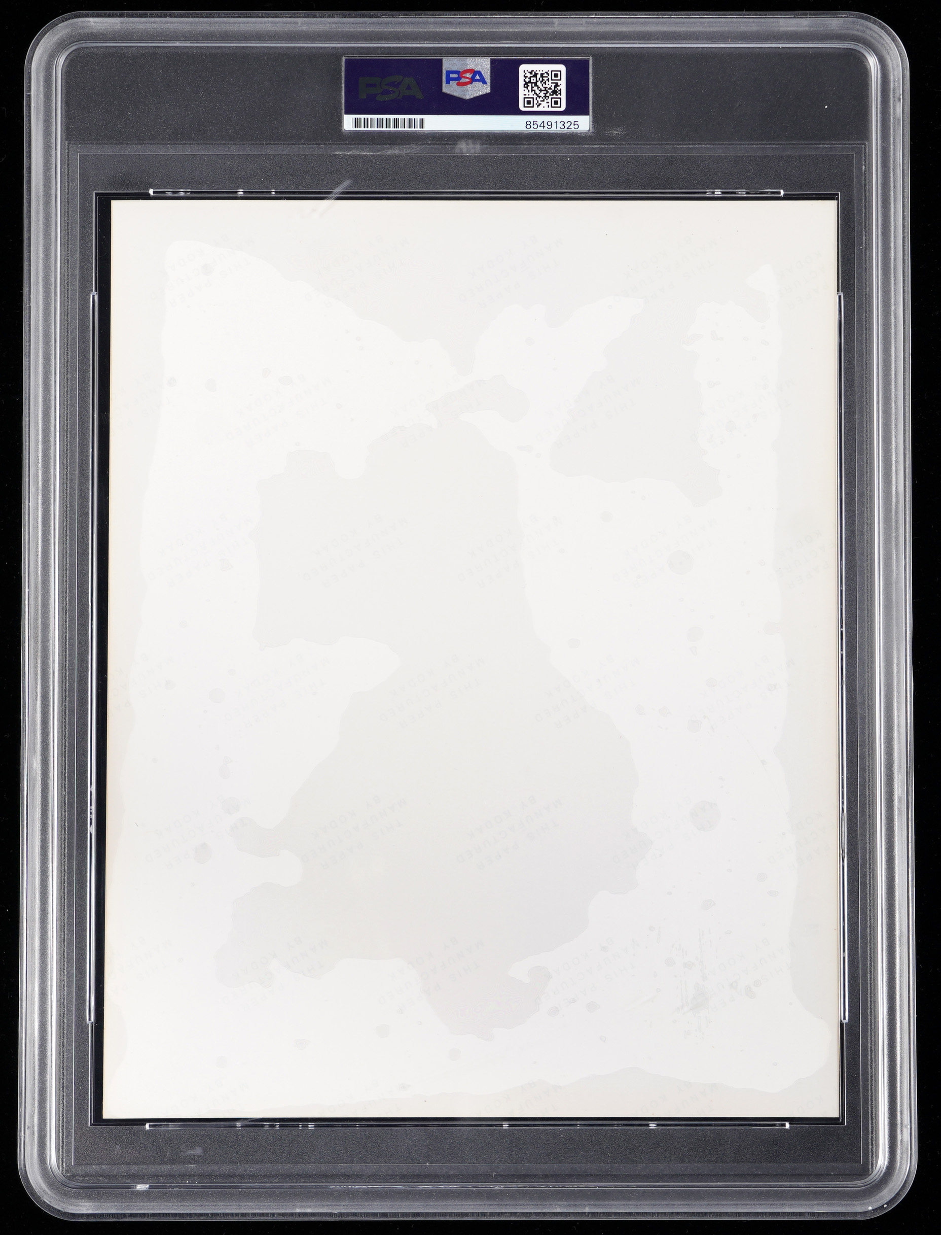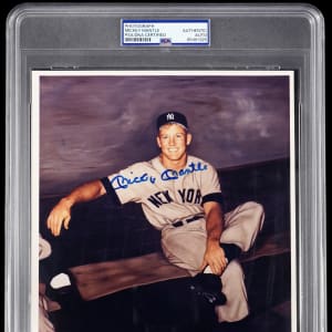A fresh-faced Mickey Mantle shows up, with this signed 1988 MLBPA photograph. This shot was originally taken in September of 1956, by photographer Ray Gallo. Flashing a big smile, Mickey looks perfectly relaxed in the New York Yankees dugout, You’d be smiling big too, if you had the kind of year the Hall of Fame slugger had in ’56, when he earned his first of three AL MVP awards, on the strength of a Triple Crown season. Mantle has planted a bold signature just above the letters of his jersey, on this appealing 8” x 10” photograph. Gallo’s credit is positioned at bottom-right, above a 1988 MLB logo. PSA/DNA Authentic Autograph.