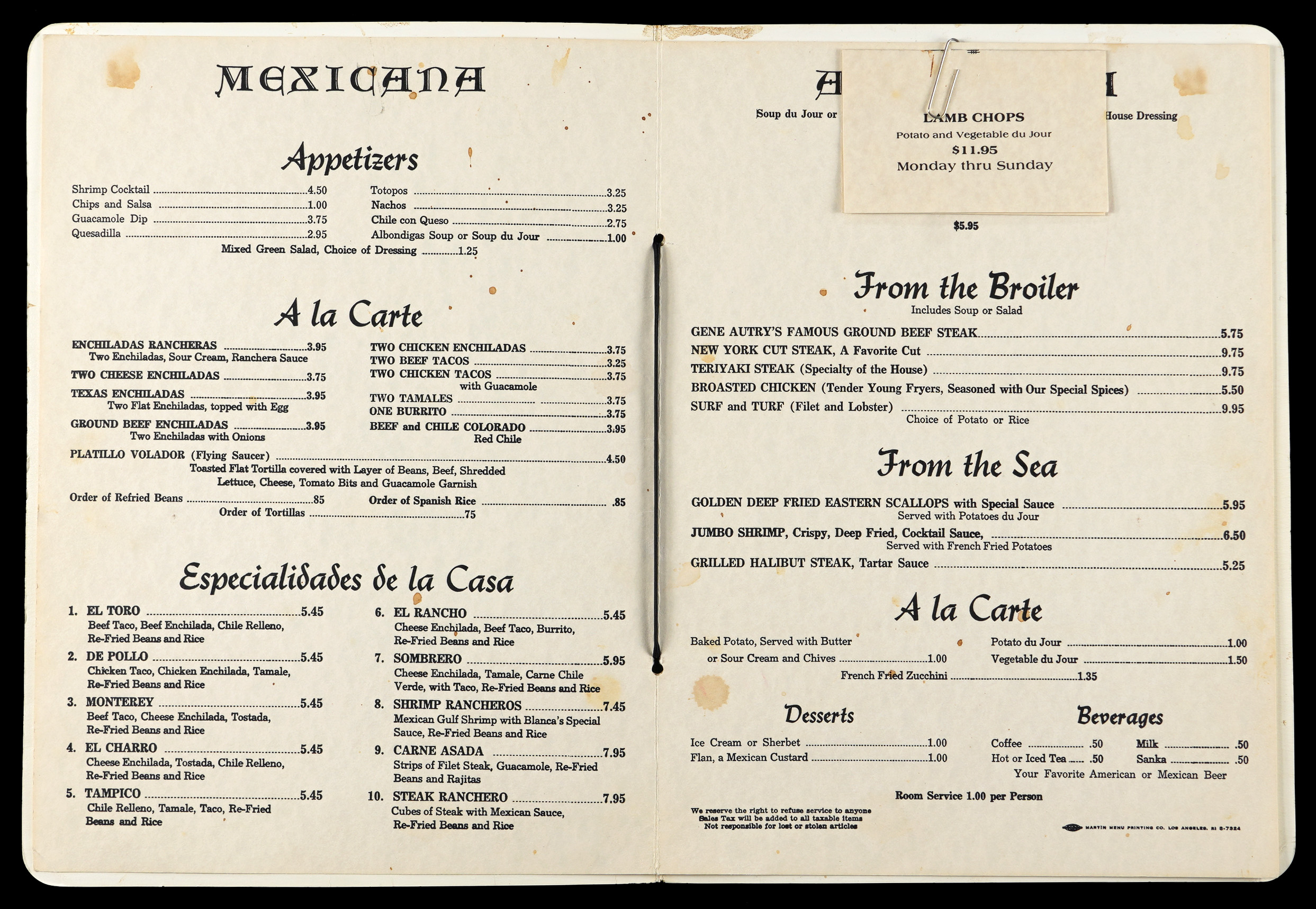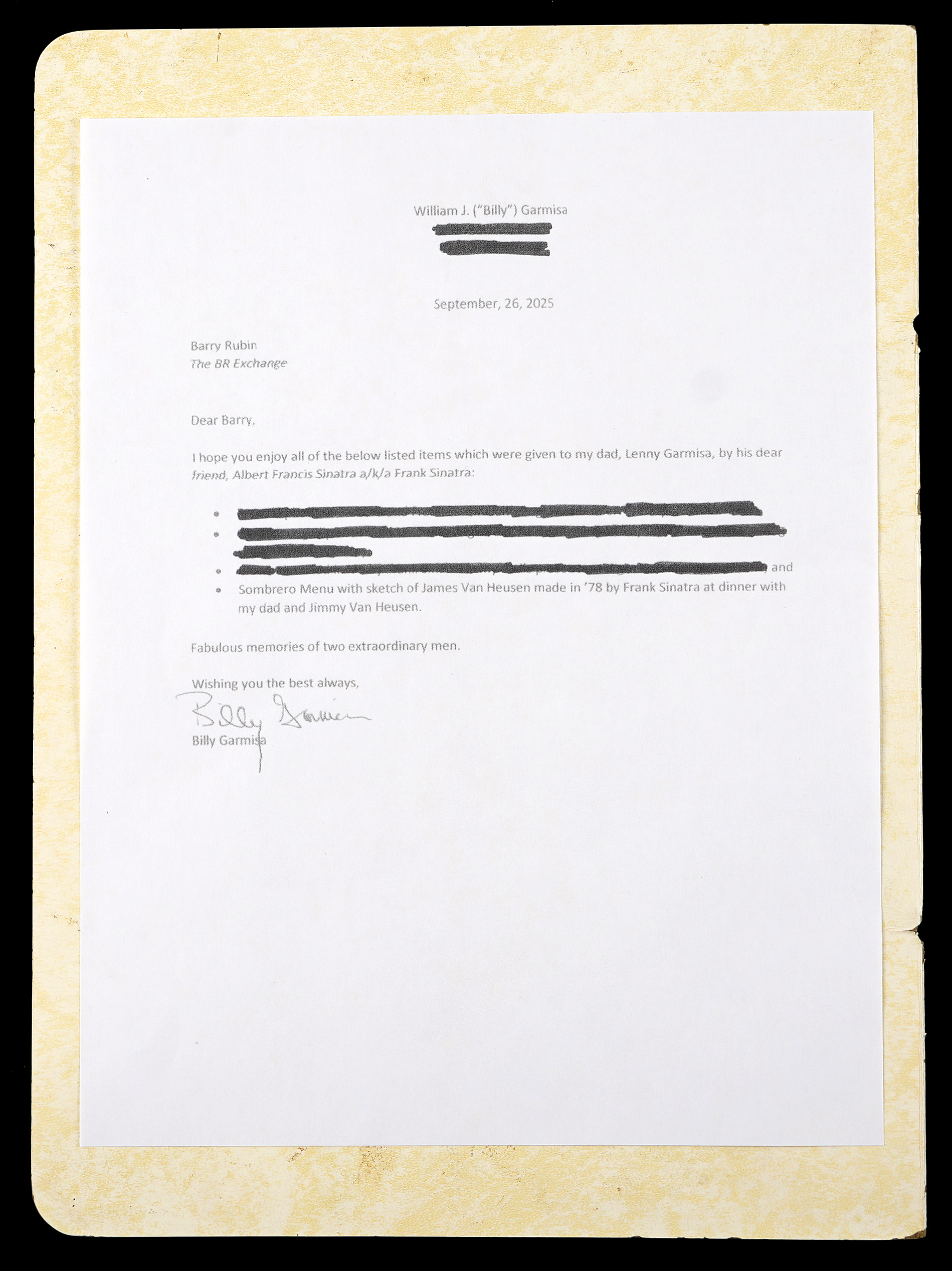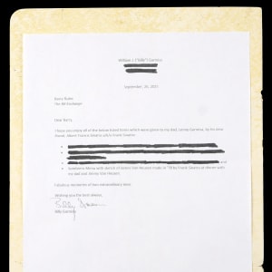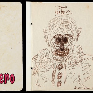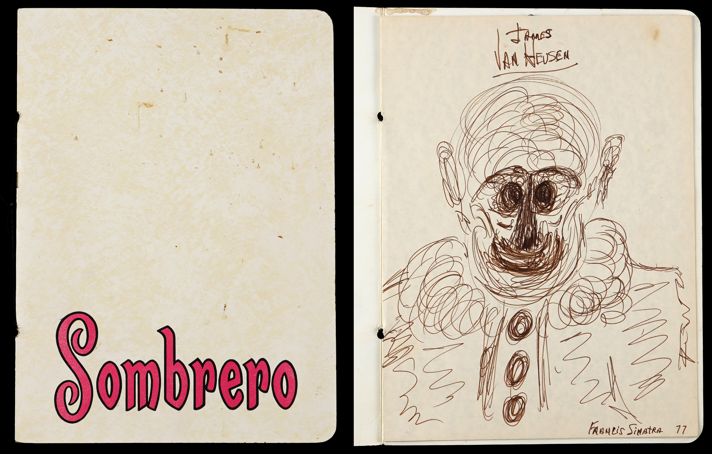 We can hear “Ol’ Blue Eyes” crooning “Send in the Clowns”, as we present this sketch by Frank Sinatra. Teamed with lyricist Sammy Cahn, Jimmy Van Heusen composed countless classic songs, including many hits recorded by Sinatra. A couple of the songs that were featured in Sinatra films won Best Song Oscars, with “All the Way” in the 1957 film “The Joker is Wild”, and “High Hopes” in the 1959 film “A Hole in the Head”. On top of the professional working relationship, Sinatra and Van Heusen were pals. Sinatra poked a little good-natured fun at Van Heusen, when he made this clown sketch on a menu at the well-known Sombrero Mexican Restaurant in Manhattan. This full page rendering is titled “James Van Heusen” at top, and the identifier “Francis Sinatra 77” is written at bottom-right. Due to a lack of exemplars, this Francis Sinatra name is not confirmed as being in Sinatra’s hand, though a letter of provenance accompanies from the son of a friend of Sinatra’s, who was gifted the sketch by Sinatra while having dinner with him and Van Heusen at the Sombrero restaurant. The artwork is consistent with another known clown sketch by Sinatra, who also painted clowns with some degree of skill. The offered menu remains solid with minor soiling on the front, and the Sinatra sketch is crisp and well-suited for framing.