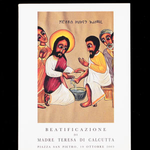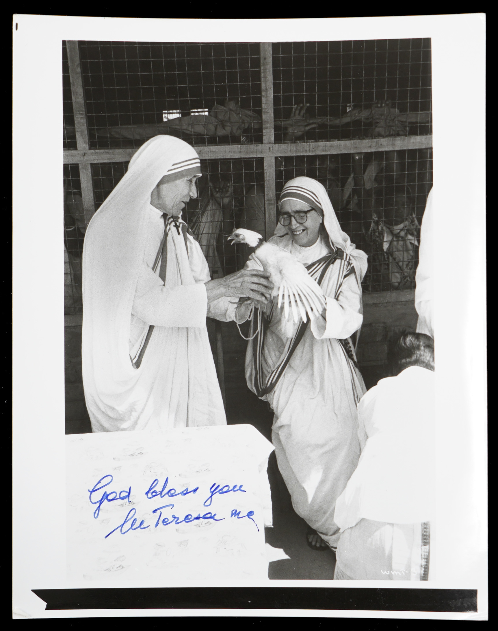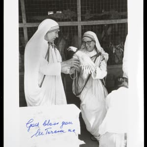 Black-and-white photograph, undated, signed by Mother Teresa (1910-1997), Catholic nun and missionary. In the photograph, Mother Teresa is pictured alongside another member of her religious order, the Missionaries of Charity. Signed by Mother Teresa in blue ink underneath her image. Also accompanying this item is a mass program and ticket from her beatification in 2003. Mother Teresa was awarded the Nobel Peace Prize in 1979 for her missionary work in India, and in 2016 she was canonized by Pope Francis. Each of the three items remains in Excellent condition overall. Auction LOA from James Spence/JSA. Total: 3 items.