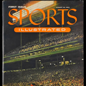 Highly desirable first issue of Sports Illustrated, published on August 16, 1954. The issue is complete with the three-page fold-out of twenty-seven 1954 Topps insert cards. The cards, which were a special promotion prepared in conjunction with Topps, makes this first issue of all the greater note to collectors. This is an outstanding example of this highly desirable first issue, with no mailing label and minor touches of wear at the corners and along the edges as well as some small areas of imperfection on the cover. A superb collector's item!